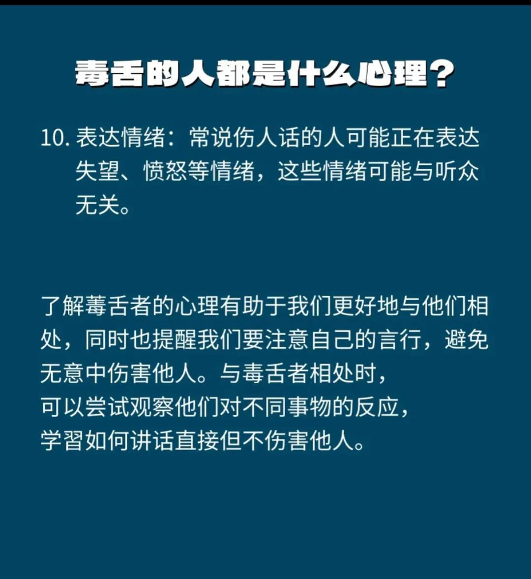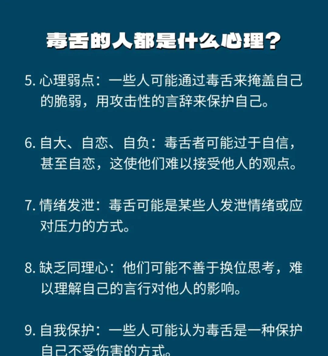 #毒舌的人都是什么心理# 你周围是不是也碰到过有很毒舌的人,说话超级难听,喜欢宣泄情绪,说话不给别人留余地,只认自己观点,听不了别人半点儿话,全是各种情绪的输出,用言语的暴力来攻击别人,甚至辱骂别人。这样的人都是什么心理?在小编认为这样的人就是一种极度自私!说别人的所有问题其实都反映了他自己的内心想法。但是有人会反驳小编,说刀子嘴豆腐心,这是俗话。但从现代心理学的角度来看,口是心非这个词并不能用在这些用暴力语言攻击别人的人身上。口是心非是一个褒义词。#毒舌文案# #毒舌网红# #毒舌真言# #毒舌这社会# #毒舌言辞# 真正的语言暴力是从各个方面来攻击对方!这是赤裸裸的自私的表现。所以如果你遇到这样一个人,最好能远离就远离,如果实在没有办法远离,那就只能顺毛驴,这个毒舌的人继续毒舌下去!变成世界上最毒舌的人就好了!
