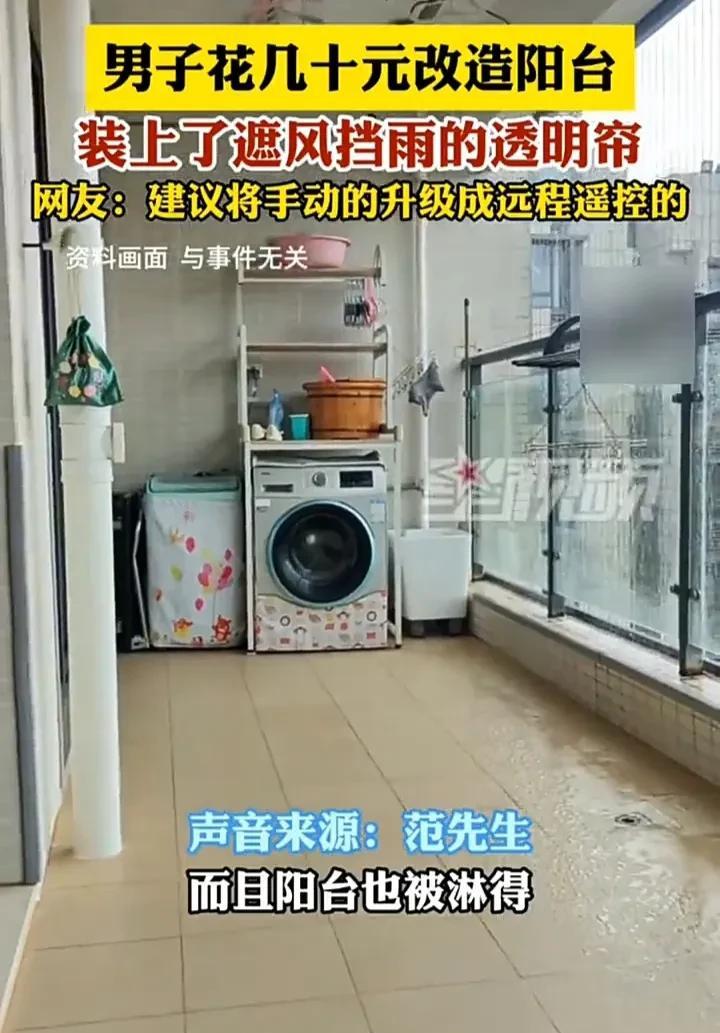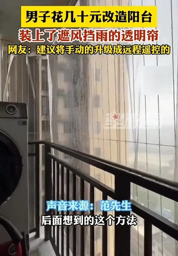 真是聪明的做法!7月28日,广东一名男子发视频称,自己家的阳台由于没有封窗,导致每次下雨的时候,都急着回家收衣服,并且雨水也会飘进厅里,但封阳台的费用太高,于是自己便花了几十元买了挡雨帘装上,现在下雨天不用愁了。