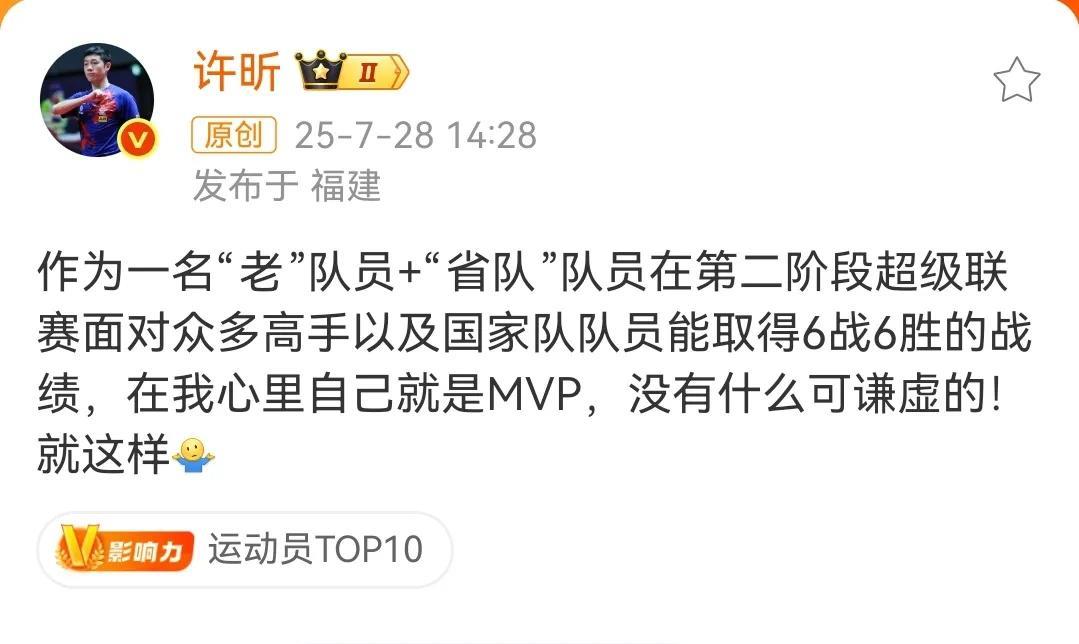 六战六胜保持全胜记录的许全面同志说了,作为一名“老”队员+“省队”队员在第二阶段超级联赛中面对众多高手以及国家队队员,可以取得六战六胜的战绩,在我心里自己就是MVP,没有什么可谦虚的,就这样。 在刚刚过去的乒超联赛第二阶段厦门站比赛中,上海地产队有六场比赛,许昕出场的比赛有三场,其中每场比赛都打了两盘,而且保持全胜,确实非常棒了! 乒超联赛第二阶段上海队还有一位灵魂人物,六场比赛,出战五场打了六盘也是全胜的记录,他就是樊振东,第一阶段上海队有五场比赛,樊振东出战四场打了七盘比赛,两个阶段一起樊振东一共打了十三场比赛,目前保持全胜的记录。 樊振东巴黎后很少参加比赛,从目前的成绩来看,樊振东依然是绝对顶流的实力,希望第三阶段可以继续看到樊振东为上海队出战。 #晒图笔记大赛#