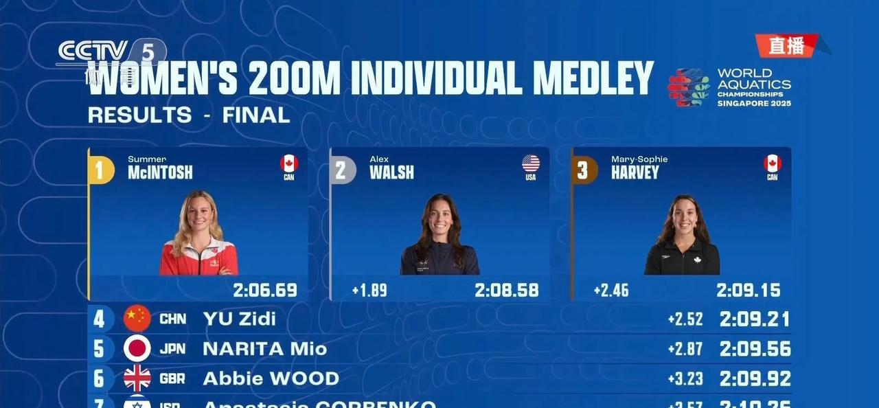 十二岁!第四名! 就差0.06就登上领奖台了! 刚刚结束的2025世界泳联新加坡世锦赛女子200米混合泳决赛中,12岁的于子迪成绩2:09.21,获得第四名。 12岁的妹宝能进决赛和一众高手对决,最后冲刺太厉害,没白来,未来继续加油! 据说这个项目是她最弱的一个项目,她的主项是400混和200蝶,之前她的冠军赛成绩都是奥运决赛水平[赞]。
