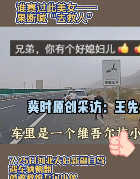 “这就是中国人的素质!”新疆,高速遇前车翻车“封烟”,丈夫本想一走了之,不料,妻子一句话,却让丈夫改变主意,也让网友们集体破防。她说:你要救他,他不救不行啊,他人必须出来啊,人得活命啊!丈夫冷静将车停应急车道,路过的3辆车也同时停车施救。网友:人美心善头脑清醒! 在新疆吐和高速公路上,一场突如其来的车祸,展现了人性最朴实而又最闪亮的一面,当危机降临,几位素不相识的路人用行动诠释了什么是真正的"路见不平"。 7月25日,一个阳光炙热的午后,河北保定的王先生夫妇正驾车在新疆的公路上享受自驾游的闲适,突然间,前方传来一声巨响,一辆车失控冲出路面,翻滚着栽进路边的沟里,扬起漫天尘土。 这惊心动魄的一幕,本可能成为旅途中的一个惊吓过后的谈资,但王先生的妻子,这位平日里担任幼儿园教师的女性,在那关键时刻展现出了超乎寻常的冷静与决断。 "停应急车道去,你得救他,人必须出来,人得活命啊!"她的声音不高,却掷地有声,这简单的一句话,不仅改变了丈夫原本可能继续前行的决定,更在随后引发了一场集体救援行动。 令人感动的是,当王先生夫妇停车前往救援时,后方又有三辆车几乎同时停下,这些互不相识的司机们,没有任何犹豫,纷纷翻越护栏,奔向那辆四轮朝天的事故车辆。 现场情况紧急,车门已经变形,车内一位维吾尔族小伙被困,情况危险,王先生的妻子临危不乱,一边指挥丈夫从后备箱取来撬棍,一边组织其他人合力拉扯变形的车门。 "一、二、三!"随着一声号子,几个陌生人齐心协力,终于将变形的车门拉开,他们小心翼翼地将受伤的司机抬出,王先生的妻子还从包里取出纸巾,为伤者擦拭额头上的血迹。 整个救援过程仅用了十分钟,而这十分钟的果断行动,很可能挽救了一条生命,没有人思考可能被讹诈的风险,没有人犹豫自己是否有责任参与救援,有的只是"人得活命"的本能反应。 这起事件之所以引发广泛关注,不仅因为救援本身,更因为它折射出的社会价值,在一个时常被质疑冷漠的时代,这样的集体善举证明,人与人之间的互助精神从未消失。 王先生事后感慨道:"刚才多亏你,我都没往细想,"而他的妻子则平静地回应:"谁遇上都得管,总不能眼睁睁看着,"这简单的对话,道出了善良的本质,它不需要理由只需要行动。 "一个好汉三个帮",正是因为有了第一个停车救人的决定,才有了后续三辆车的跟进,善良如同接力棒,需要有人勇敢地迈出第一步。 在这个高速运转的社会里,我们或许会为了赶路而忽视路边的风景,也可能为了避免麻烦而对他人的困境视而不见,但王先生夫妇和那三辆车的陌生人提醒我们,在生死攸关的时刻,人性最基本的善良与勇气,才是我们最宝贵的财富。 这不是一个惊天动地的故事,却是一段照亮平凡日常的温暖光芒。 麻烦看官老爷们右上角点击一下“关注”,既方便您进行讨论和分享,又能给您带来不一样的参与感,感谢您的支持! 信息来源:四川观察《人美心善头脑清醒!7月25日吐和高速,遇前车冲下道路“封烟”,妻子冷静指挥丈夫营救事故车辆,路过的3辆车同时停车施救。》2025.07.26