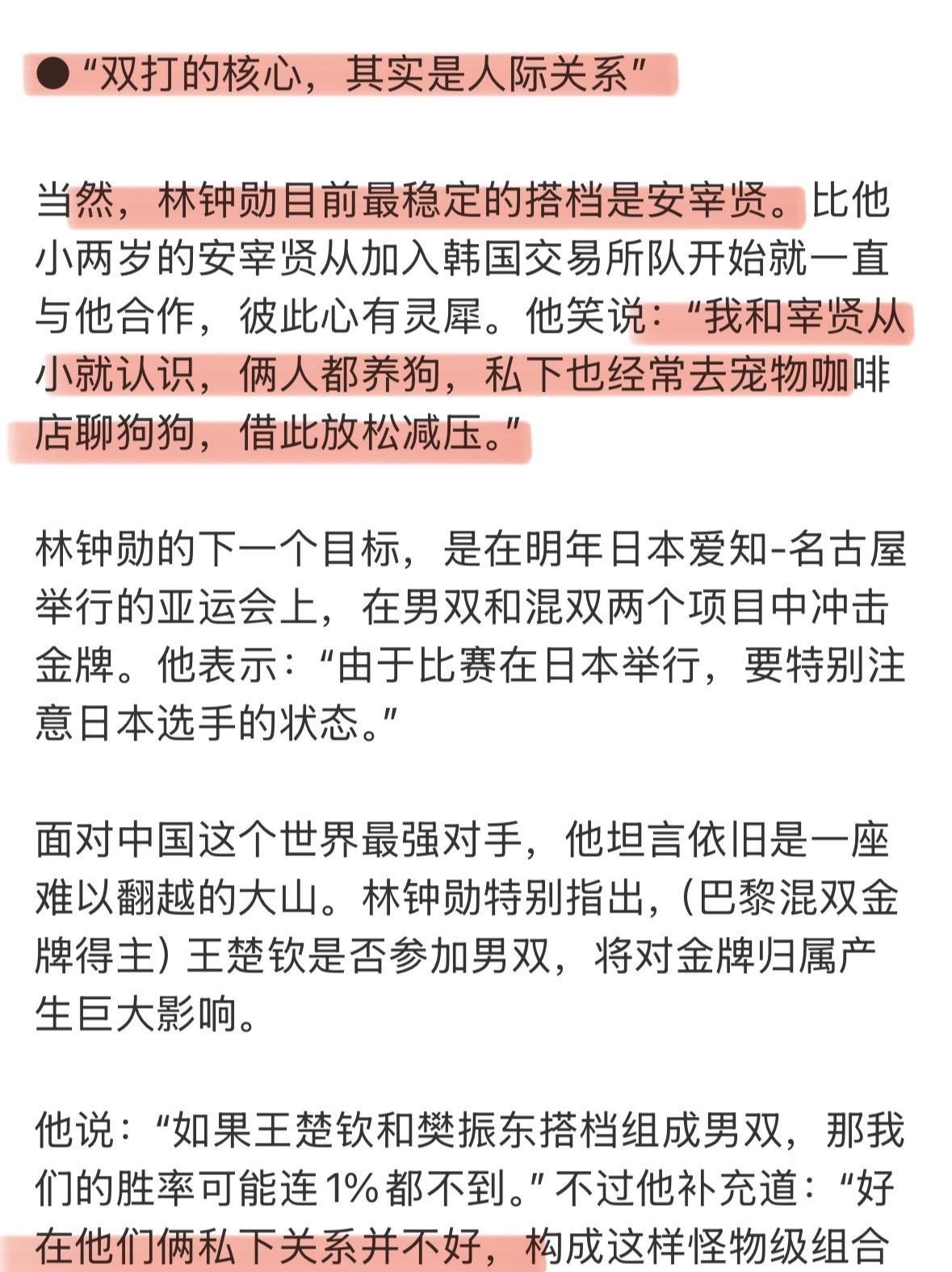 国乒迷信男双左右配,不料王楚钦周启豪的超绝左右手男双,被黄石的双右手直横配薛飞/向鹏打败。 直板的薛飞拧爆了,横板的向鹏燃尽了,他们两个人就能让“男双的神”王楚钦无奈,打掉周启豪的电池。 相似的场景出现在美国大满贯。 同样是右手直板的费利克斯·勒布伦,搭配右手横板的费利克斯·勒布伦,能够3:0横扫王楚钦/梁靖崑。 这也是在男双入奥后,王楚钦、梁靖崑第一次正面迎战勒布伦兄弟。 在男双4月宣布重返奥运会后,国乒的男双再也无法像以前那样制霸世界。 整个国乒团队,在男双领域,只拿到了一站400积分的太原常挑赛男双冠军,甚至是双右手的向鹏/徐瑛彬拿到的。 他们在决赛赢的是香港队的黄镇廷/陈颢桦。 但是,同样是决赛面对黄镇廷/陈颢桦,国乒的左右手搭配黄友政/薛飞,却无法取胜他们,最后遗憾摘亚。 其实最近韩国男双的神林钟勋发话了,其实双打的核心,就是人际关系。 所以他们能够拿完亚锦赛男双冠军,再创造历史,首次打破国乒垄断,豪夺WTT大满贯男双冠军。 其实国乒一直拿大满贯作为最大的实战练兵场,然而,大满贯的双打冠军,首次出现了非CTTA获奖者。 林钟勋顺手蛐蛐了樊振东、王楚钦的私人关系。 尽管在理论上,樊振东、王楚钦的男双应该天下无敌,如果他们合体,征战亚运会男双冠军,他和安宰贤连1%的获胜可能都没有。 但这样的事情不会发生,因为“王楚钦、樊振东私下关系并不好。 所以这样的怪物级别双打,出现概率超低哦。他们两个人连巴黎奥运会赛前都不一起训练,因为男单争冠关系紧张~” 其实从男双宣布入奥后的冠军得主来看,的确双方的默契度、关系,要比左右手更符合公式。 亚锦赛、美国大满贯男双冠军安宰贤、林钟勋是青梅竹马,两个人一起聊着狗狗,喝着咖啡; 世乒赛的男双冠军户上隼辅、篠塚大登,论实力没有很强。 但是在那个限定的赛场里,他们的默契无与伦比,因为这是唯一一对原班人马,从巴黎奥运会成功走到多哈世乒赛的男双阵容。 徐瑛彬、向鹏,两个正手利的右手,互相取暖,拿了国乒太原唯一的冠军。 到今天,薛飞、向鹏硬生生给战神林诗栋杀出一条血路,你若砍两分,男双必凑一分,无关对手,只争朝夕。 毕竟黄石就这么三个人,两眼一睁,全军出动。 向鹏这么晕左,都忍住没一看到王楚钦,就昏过去。 他在第一局被速通后,甚至努力改变战术,坚决接发拧拉,让王楚钦前三板拿不到优势,比分就扳回来了,这局直接爆分。 向鹏都能为爱发电,想给好哥们凑一分,面对世界第一男左,奋斗到爆分。可歌可泣。