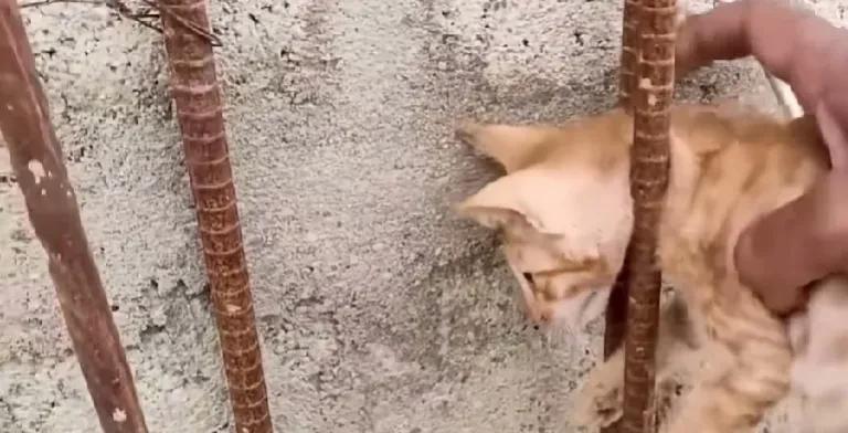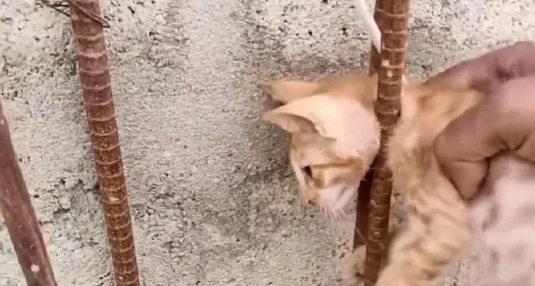 早晨出去锻炼,发现墙角一只流浪猫不知道什么原因头钻进了钢筋的缝隙里,它喵喵叫着拼