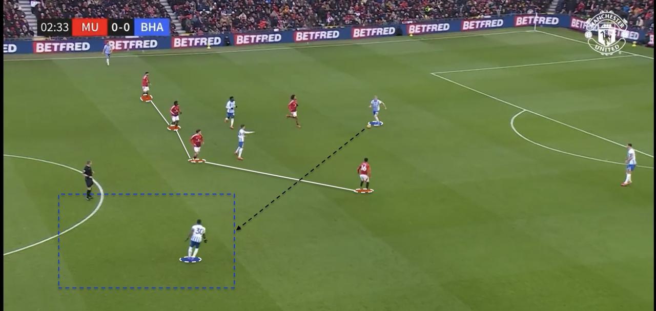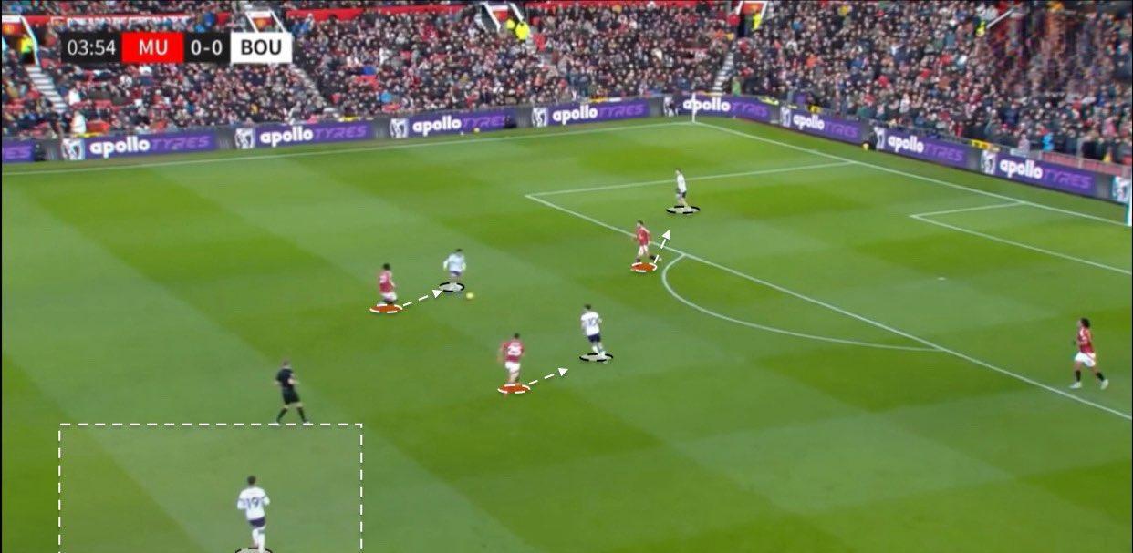 曼联的防守问题,在社交媒体上再次频繁被讨论 曼联2-1西汉姆的比赛已经过去好几天了,可是有一个核心问题依然在社交媒体上被广泛讨论:曼联怎么能给绍切克如此大的空间,大概是图一的站位情况,曼联在执行高位逼抢的时候,绍切克在曼联的两线之间处于空位,周围没有任何曼联球员。 绍切克就是在这个位置轻松接到队友的传球,从而撕开了曼联的防守。然后就有球迷把上赛季的一些比赛场面给贴出来了,表示大惊小怪,这个问题上赛季都看惯了。滕哈赫时期出现过,阿莫林时期也出现过。 其实这个问题,在索肖时期也有,不过索肖的应对办法是马奎尔顶出去,顶在后腰的位置组成双后腰。在滕哈赫执教的早期,解决办法是利马顶出去,跟卡塞米罗组成双后腰,利马伤了之后,这个问题近乎无解,这就是为什么有一部分球迷觉得曼联必须配置双防守后腰的原因。 问题是,曼城、阿森纳、利物浦用的办法,其实也是中后卫要顶出去,你任何想要压出去进攻的球队,总是会面临这个问题。阿莫林时期的三个中后卫,更多用的是德里赫特顶出去,也就是居中的中后卫去顶,不过效果并不好。