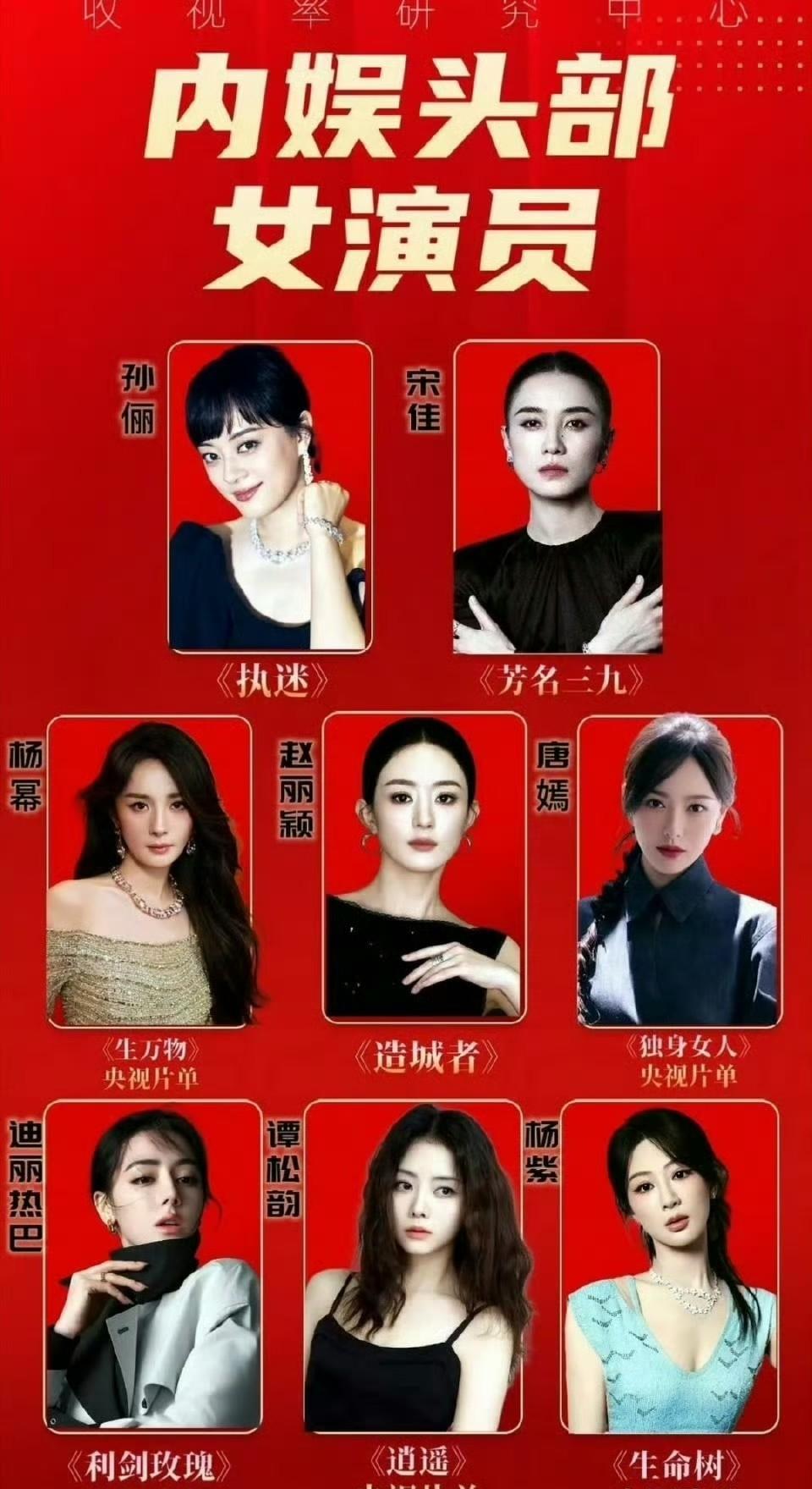 内娱头部女演员 孙俪,宋佳,杨幂,赵丽颖,唐嫣 加上三个90花,热巴,杨紫,谭松