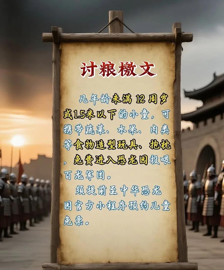 啊呀!文旅常州又搞事情啦!本周末常州队要客场迎战盐城队,这不!常州文旅又整大事啦—— 凡年龄未满 12周岁或1.5米以下的小童,可携带蔬菜、水果、肉类等食物造型玩具、抱枕,免费进入恐龙园投喂百龙军团。 言外之意就是年龄未满12周岁的或者1.5米以下的小朋友,都可以免费游恐龙园。 要知道恐龙园的门票可不低哟!成人票要298元一张,儿童票也要180元一张。如今免票活动来了! 机不可失时不再来哟!不过须提前至中华恐龙园官方小程序预约儿童免票。 全国各地的小朋友们,你想看恐龙吗?你想和恐龙来次亲密接触吗?那就赶紧来中华恐龙园吧!常州欢迎你们。 #分享城市新鲜事#