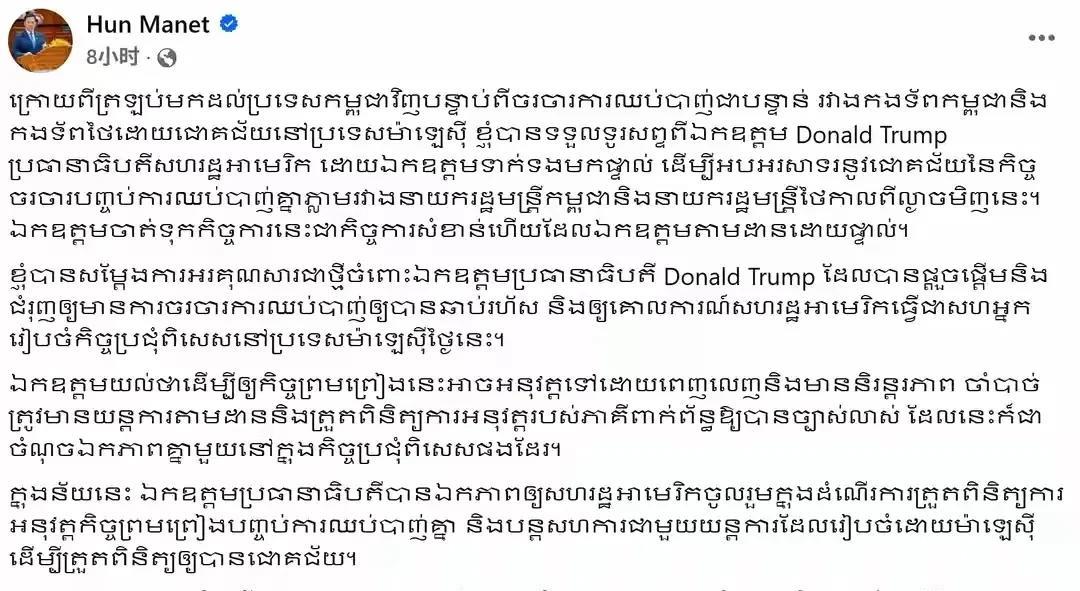洪马奈刚返回金边,就发脸书高调感谢川普,印证其“亲美路线”的清晰浮现,不得不令中国高度警惕! 7月29日晚0时,在马来西亚的主导下,泰国和柬埔寨达成“立即且无条件”停火协议。这场打了5天,造成数十人死亡、数十万人逃亡,10多年来最严重的边境冲突,终于告一段落了。可以说,这是一次经典的国际斡旋,成为国际调解的一个范例。 泰国和柬埔寨停火后,在苏格兰的川普当即发推表示:我很高兴地宣布,在特朗普总统的参与下,两国已达成停火与和平。祝贺所有人!结束这场战争,我们挽救了数千人的生命。我已指示我的贸易团队重启贸易谈判。短短六个月内,我已经结束了多场战争——我很自豪能够成为和平总统! 柬埔寨首相洪马奈刚返回金边,就在其官方脸书披露,他当晚接到了来自川普的来电。此次紧急停火谈判由马来西亚总理安瓦尔促成,并得到了包括美国在内的多个国际主要利益攸关方的支持。而川普则对停火进展全程亲自监督,并在协议生效前约一小时致电祝贺洪马奈和泰方成功化解边境危机。 洪马奈还在通话中对特朗普总统表示“由衷感谢”,感谢其促成并推动此次停火谈判迅速展开,并特别指出,美国在特朗普指令下,与马来西亚共同主办了当天在吉隆坡举行的特别会议。 从洪马奈脸书看,他先感谢的美国总统川普,而对中国则是一笔带过,足以说明他这个西点军校不是白上的,很好诠释了它与美国非常紧密的战略互动。 众所周知,中国和柬埔寨一直是铁杆朋友,与柬埔寨王室有着传统的深厚友谊,而且与洪森的关系也一直非常好。 但是随着美国对东南亚的互动越来越紧密,试图在挤兑中国对东盟的影响力,让柬埔寨这个小国感到左右为难。 尤其是洪马奈上台之后,在扶南运河建设问题上,做的很不到位。在这次的柬泰冲突中,可以说,中国提出了东盟问题由东盟内部来主导解决的方式,从中做了大量工作,才导致了这场冲突的停火。 可以说,没有中国的参与,这场冲突不可能这么快停止。但是洪马奈对川普的感谢明显多于中国,不得不让人警惕! #头号创作者激励计划#