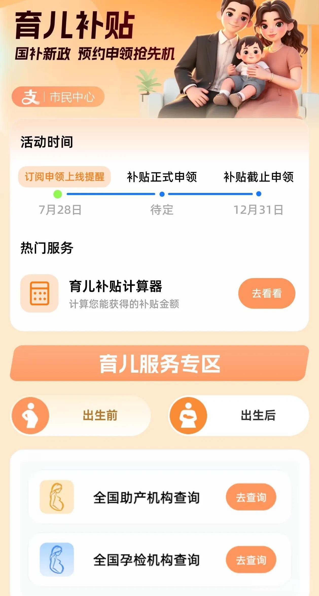 育儿补贴线上申领入口 支付宝-市民中心-全国通办 输入幼儿出生年月可以计算领取金额 正式申领尚未开通 但这个事应该是板上钉钉了 人呢我们等时间就行
