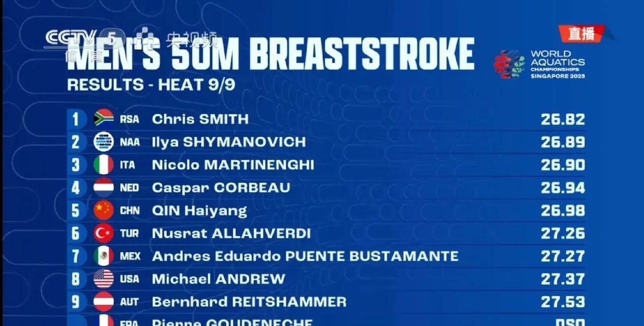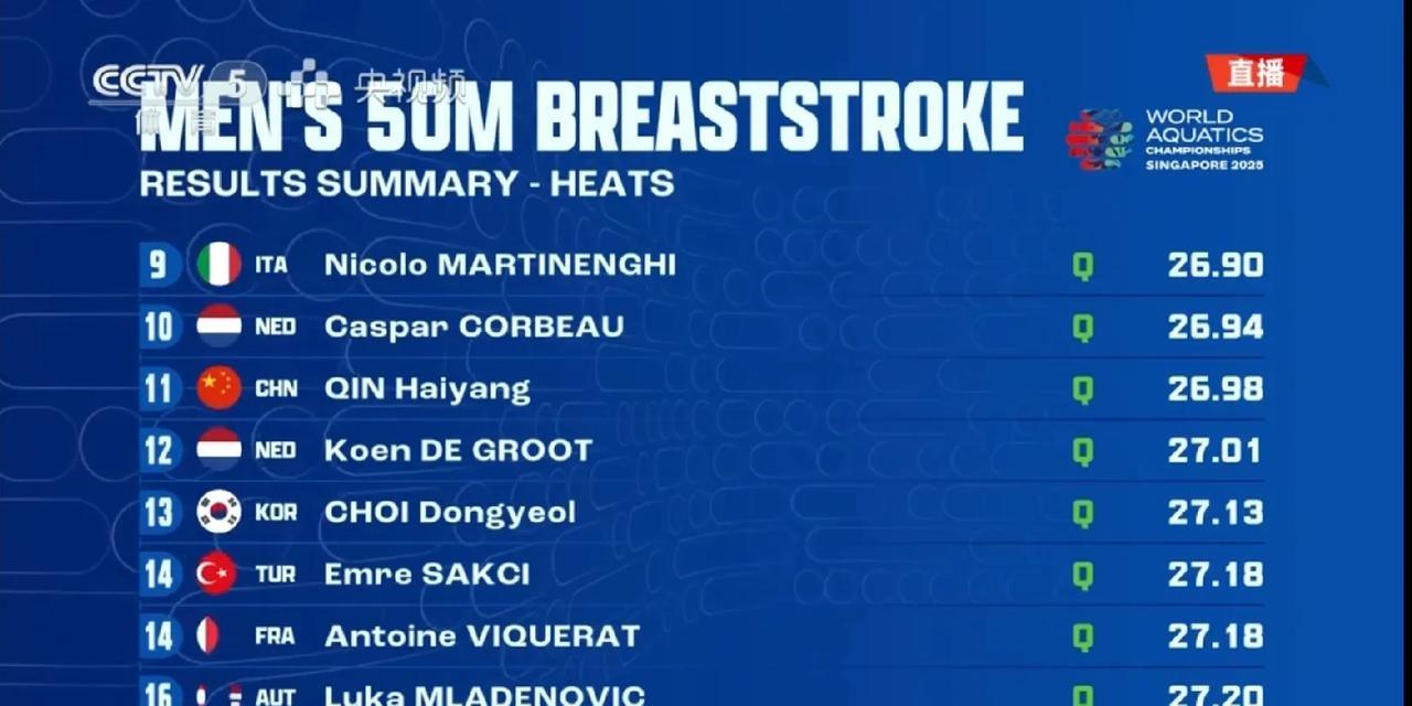 孙佳俊小组第7,无缘半决赛,50米蛙泳一轮游。 他让大家失望了,状态如此之差,不知发生了什么。 覃海洋平稳发挥,小组第5,总成绩第11,安全进入半决赛。 半决赛的覃海洋,应该要发力了。