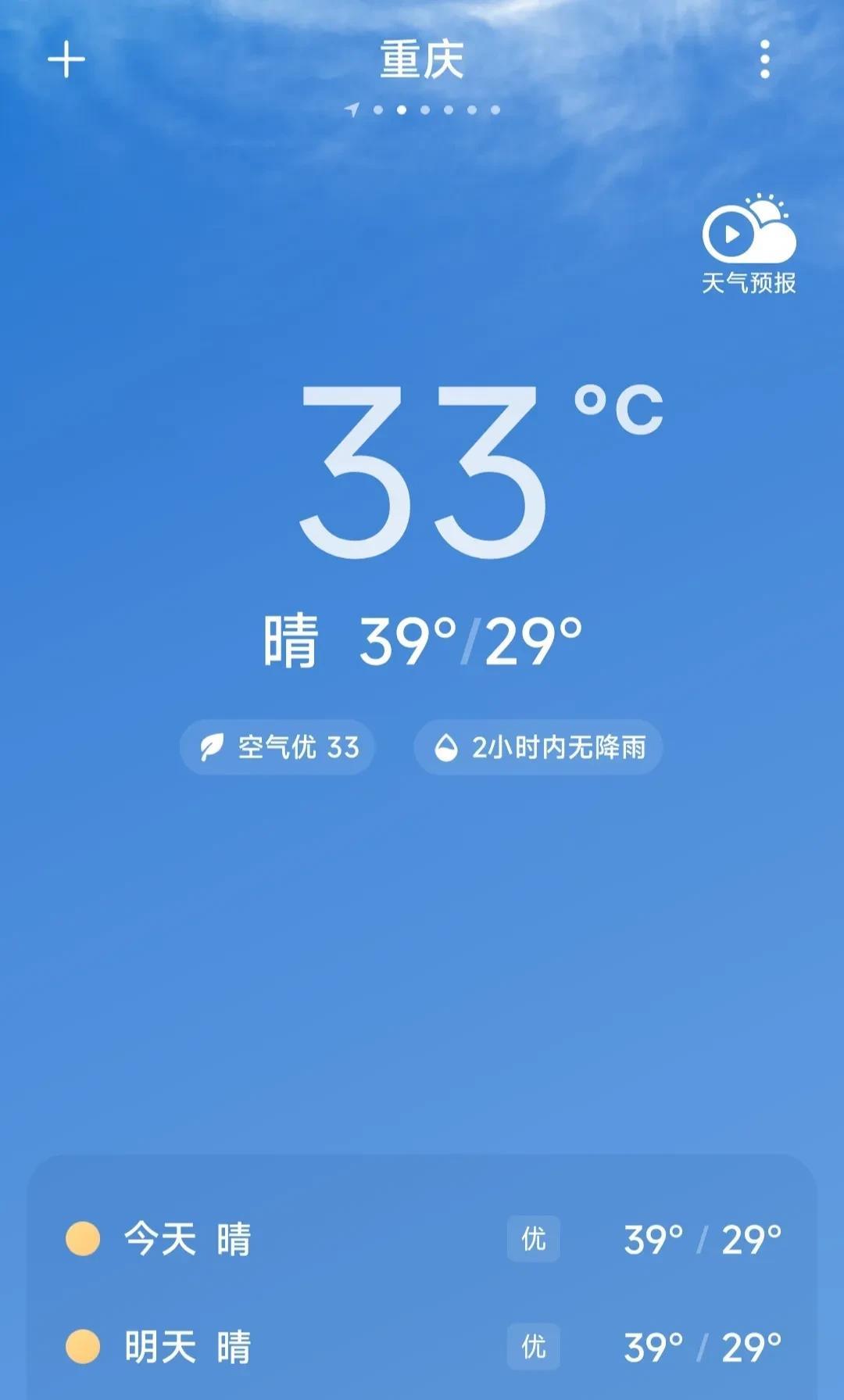 今天预报26到33度,天气晴热。外面虽然还是很热,但有一点凉风。重庆今天29到3