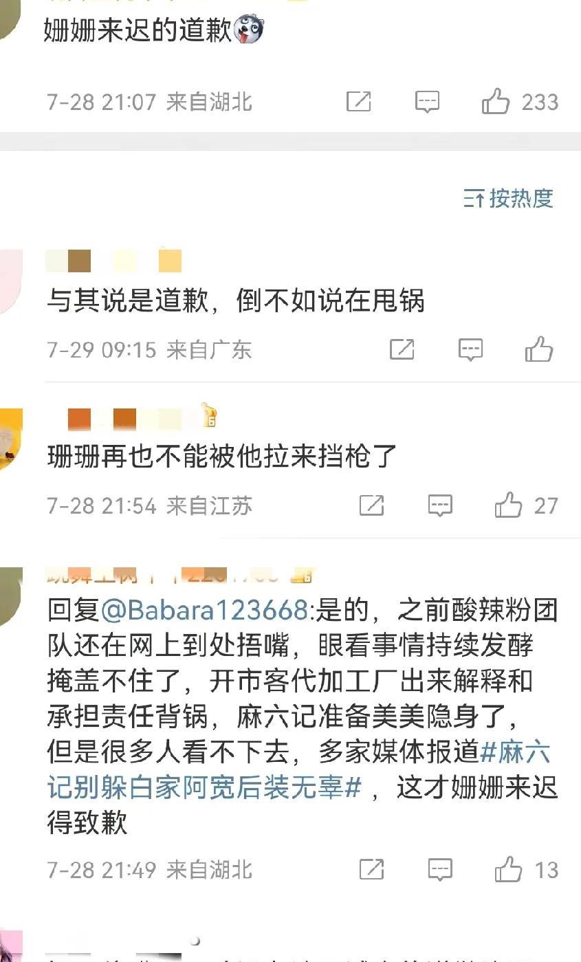 张兰被“打脸”了!张兰之前说麻六记的酸辣粉都是自家工厂生产的,但最近麻六记酸辣粉出现了发霉情况,不少消费者投诉,最后麻六记发声明又甩锅说是发霉批次给代工厂加工生产的,他们会严查。 网友们看后恩加炸锅了,因为张兰之前一直说他们有很多条生产线,从来不用代工厂,养活了上万的工人和家庭,现在东西出问题了,就说是代工厂的问题,可是按照张兰之前的说法,租的生产线,员工和配方也都是他们自己的,出了问题和代工厂也没有关系吧? 还有网友称,麻六记的酸辣粉发霉不是一两天的事情了,之前就有很多消费者投诉,但麻六记从来没有处理过,态度很敷衍,现在是被媒体报道的出来,麻六记才发了声明。 不少网友通过这件事,都觉得张兰的话越发不可信了,还天天标榜自己是人民企业家,实在是可笑。