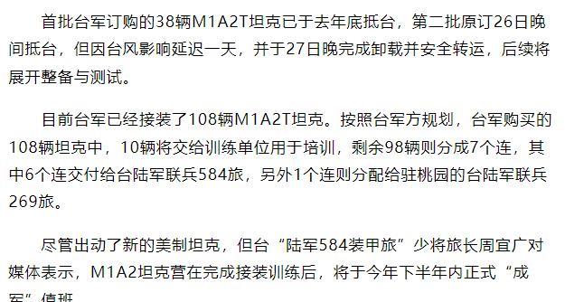 第二批共42辆“艾布拉姆斯”坦克运抵台湾。目前台军已经接装了108辆M1A2T坦