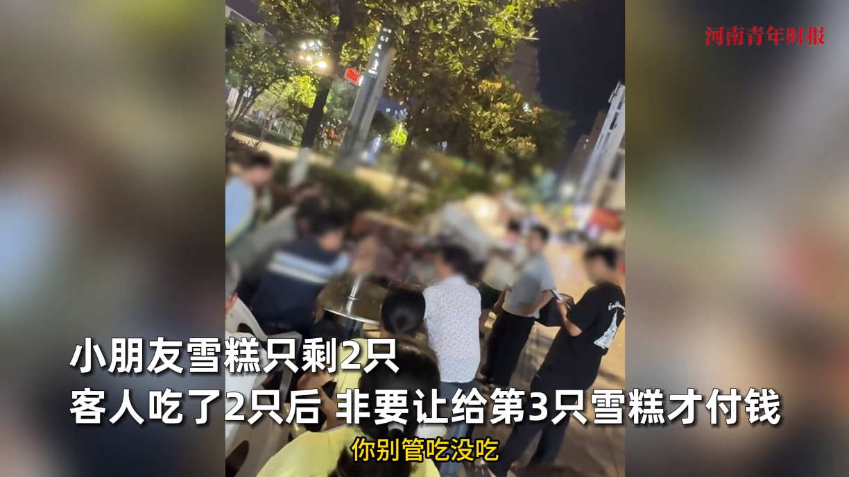 可就在这时,旁边吃烧烤的三个人走了过来,表示要买3个雪糕,让小朋友卖给他们,可在只有两个雪糕的情况下,3个人竟然二话不说就把雪糕吃掉了。