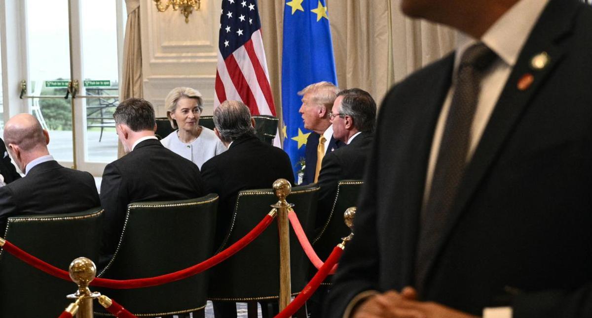 美欧关税会谈的现场是这样的,双方达成的贸易协议将对欧盟出口商品征收 15%的关税,从而结束了在最后期限即将到来之前数月的紧张谈判。 特朗普表示,欧盟同意在美国再投资6000亿美元,并购买价值7500亿美元的美国能源,包括液化天然气,这避免了美国从8月1日起对所有欧盟商品征收30%的全面关税。 有意思的是,这次会议是在特朗普位于特恩伯里的豪华高尔夫度假村举行的。