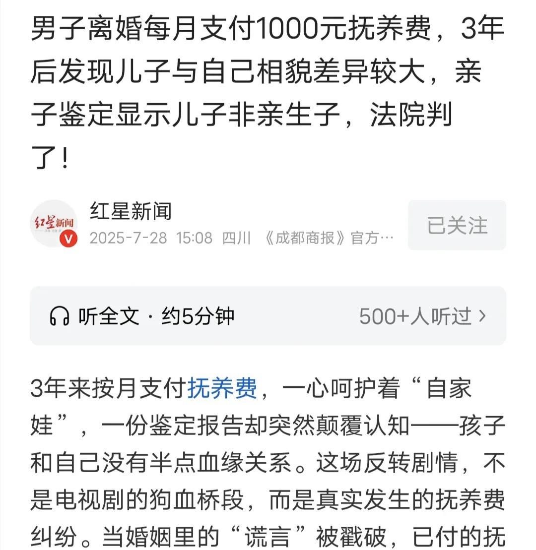 男子离婚后,儿子归前妻抚养,他每月给儿子1000元抚养费,3年后,男子发现儿子一