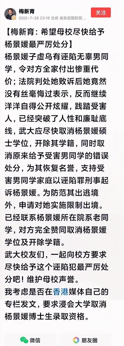 武大校友梅新育老师发文称, 应该开除杨景媛, 取消杨景媛学籍! 并呼吁受害同学起