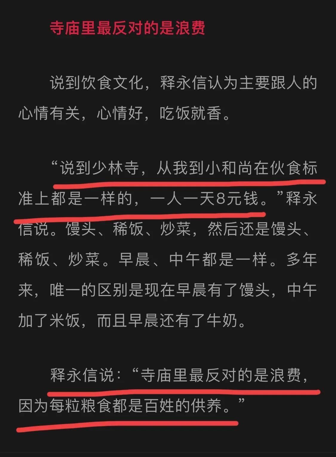 60岁的释永信,没有1根白头发, 看起来红光满面,非常年轻, 关键是,伙食完全跟大家一样, 都在一个大厅,只是座位高一点[捂脸][捂脸] 至于每餐都吃的是什么, 释永信曾经专门介绍 说作为僧人来讲, 吃饭就是解决饿的问题, 少林寺的大小和尚伙食标准一样, 以前是一人一天8元钱[流泪][流泪] 早餐就是馒头、稀饭、炒菜, 然后午餐还是馒头、稀饭、炒菜, 天天如常,都是大锅饭、大锅菜, 吃饭不会关注营养的问题, 不过,寺庙里最反对的是浪费[发怒][发怒] 为啥看起来年轻,还有点微胖, 释永信认为主要跟人的心情有关, 心情好,吃饭就香[心][心] 对于你们人生经验丰富的朋友, 少林寺的伙食情况, 你觉得怎么样? #晒图笔记大赛##万能生活指南#