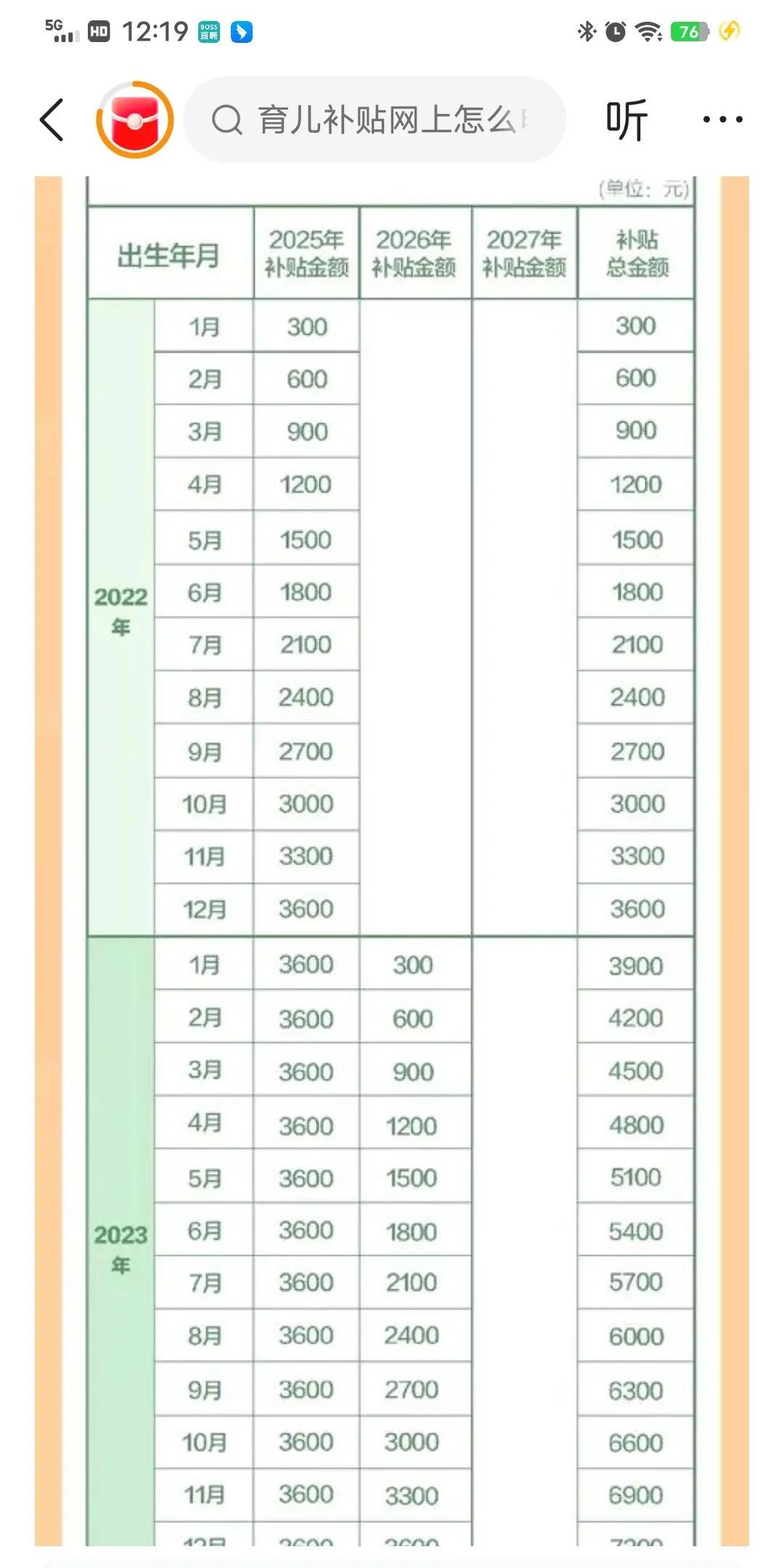 真是天降福利,国家给的育儿补贴来了。没想到的这个80尾巴上的人,还能赶上一波好福利。我家二宝是22年8月出生的,按照补贴表,还能领2400块钱的补贴呢。 刚开始我还迷糊,以为是生的越早,补贴越多,但是看后面生的晚的补贴才多,这才发现我弄错关键信息了。 这个补贴是从2025年1月1日开始领的,也就是不是补偿以前的养儿费,是从这一年的一月开始,差几个月满3岁就领几个月的钱,一个月是300元。 我家二宝是到今年8月才满3岁,那刚好就是补8个月的钱,一算就是2400元。 大家说明白了吗?到时候在支付宝搜这个育儿补贴就可以了,貌似是今年12月底申领完毕,多刷刷看什么时候可以填报。
