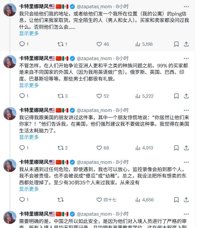 这段美国人在社交媒体发的帖子,让我想起很早之前的2个评论:非洲人在美国、在中国是完全不同的,以及美国社会的信任度其实非常低。 大概意思是,这位美国人在中国上海工作、生活了一段时间,到了要离开的时候,家里的一堆家具、带不走的东西怎么办?所以这位美国女孩拍照、发在二手交易网站上。 她不懂中文,所以她发布的信息是英文的,一群人来询价、购买,来的都是外国人,在成交之后自然涉及交货,有快递、上门自提两种方式,美国女孩公布了自己的居住地址,让人上门自提。 所以她用了How safe china is作为标题发了这封帖子,她说她跟美国的朋友分享过这件事,结果她的朋友都吓坏了,说在美国最好不要这么做,在美国生活要时刻保持警惕和恐惧。 我记得很早之前就有人分享过2件事的。首先,是一位美国网友来中国调查非洲人在中国的生活情况,他去了山东、广东两个地方,他得出的结论是:非洲人在中国更懂得礼貌、更懂得尊重人、行为更为得体,可是在美国的不少非洲移民都很张扬,甚至有点那啥。 另一个事情是来自一家美国本土论坛的帖子,大概是一位美国老白人的吐槽,说美国人在日常生活中已经养成了相互戒备、陌生人之间已经没有了信任基础,90年代的美国并不是今天这样的。