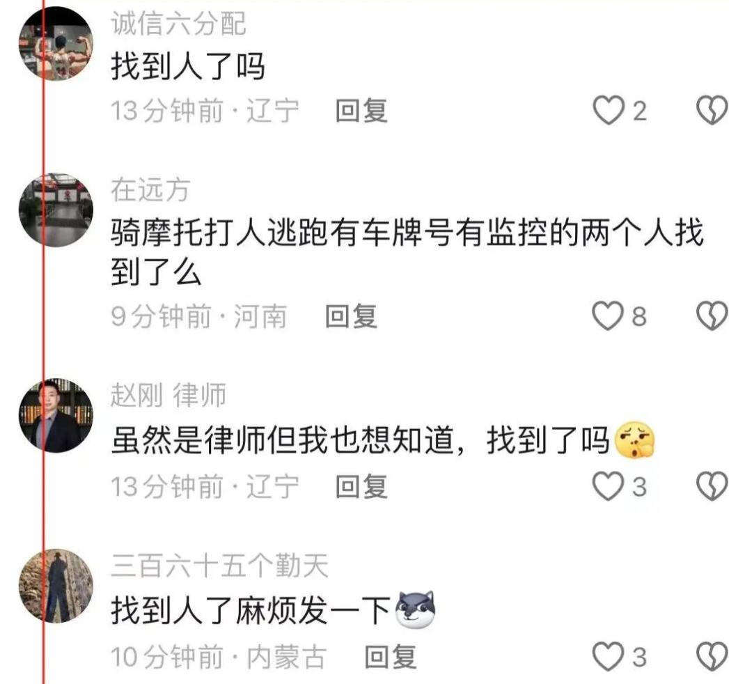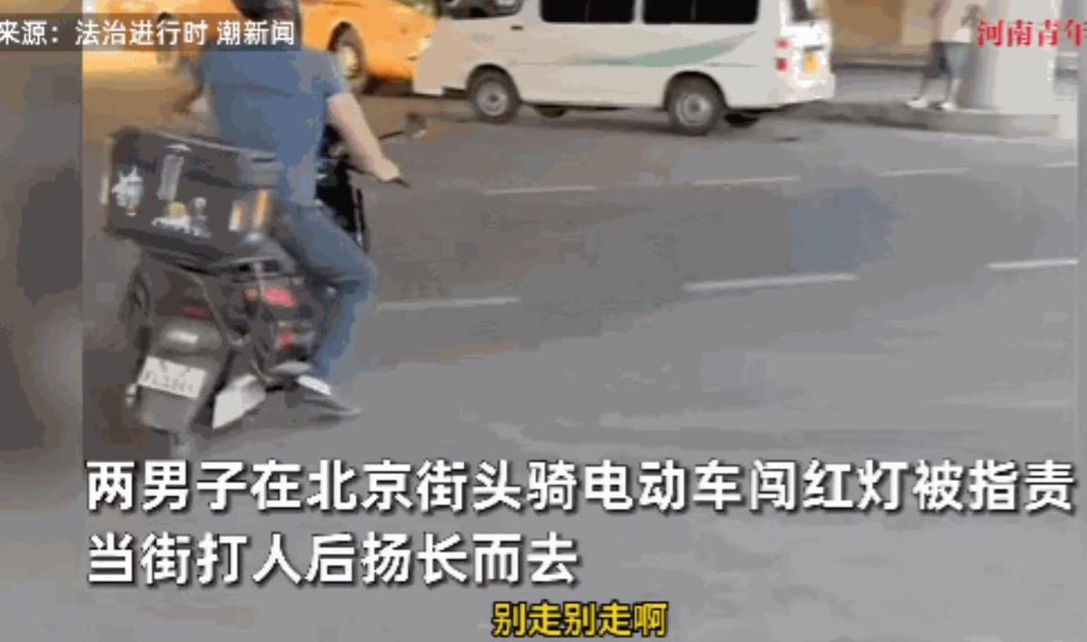 “严查到底!”2025年7月,北京,一夫妻俩骑车在路上正常行驶,却突然被两位闯红灯的男子差点撞到!丈夫指责了一句对方,谁知他们却直接下车对丈夫大打出手,丈夫全程没还手,生怕被认为是互殴,可没想到两个打人的男子却事后扬长而去! 2025 年 7 月,北京的一条路上,一对夫妻正骑着车往前赶,谁也没料到旁边突然窜出两辆闯红灯的电动车,差点就撞上他们,丈夫下意识地说了句,让对方看着点路怎么还闯红灯呢。 就这一句话可捅了马蜂窝,那两个骑电动车的男的,二话不说就下了车,上来对着丈夫劈头盖脸一顿打,拳头巴掌没停,其中一个人下手特别狠,还朝着他裆部踹了好几脚。 整个过程里丈夫愣是没敢还手,不是他怂是他心里清楚,一旦还手这事说不定就变成 “互殴”,到时候就算自己占理也说不清了,他就那么站在那儿,忍着疼挨着打,想着等警察来评理。 还好妻子没慌神赶紧掏出手机,把整个过程都录了下来,视频里能清清楚楚看到那两个人有多嚣张,拳打脚踢没轻没重。 直到旁边路过的人看不下去上来拉劝,那俩人才骂骂咧咧地骑上电动车跑了,丈夫疼得直咧嘴,还是硬撑着记下了其中一辆车的牌照,这成了他最后能抓住的一点线索。 事后丈夫去做了鉴定说是轻微伤,手里有视频,有牌照,按说这事儿挺清楚的,打了人就得负责任,可一个多月过去了那两个打人的,照样该干啥干啥一点事儿没有。 夫妻俩当天就报了警,可案子就这么搁着了,问起来就说还没找到人,这就让人想不通了,北京城里到处都是监控,找两个骑着电动车的大活人,怎么就这么难? 有人猜是不是车牌是假的,也有人说可能监控没拍到关键地方,可不管怎么说打人的人就这么逍遥法外,实在让人心里堵得慌。 这事儿传到网上好多人都气坏了,大家都在说,必须严查到底!本来就是对方闯红灯不对,还动手打人,这也太无法无天了,更让人难受的是,被打的丈夫明明占理,却因为怕被算成 “互殴”,连手都不敢还,结果呢坏人倒是跑得痛快。 有人说现在这规矩有时候让人摸不着头脑,遇到事儿了,还手吧怕担责任,不还手吧就得受委屈,就像这对夫妻,按 “规矩” 来,不还手,等着法律给公道,可等了这么久,啥动静没有,这让普通人遇到事儿的时候心里都没底了。 大家都盼着能赶紧把那两个打人的找着,该怎么处理就怎么处理,不然的话以后谁还敢站出来说句公道话?谁遇到这种事儿还敢指望法律能护着自己? (信息来源:法治进行时——2男子闯红灯被指责,当街打人后扬长而去,被打者全网寻人:已报警,我全程没还手)