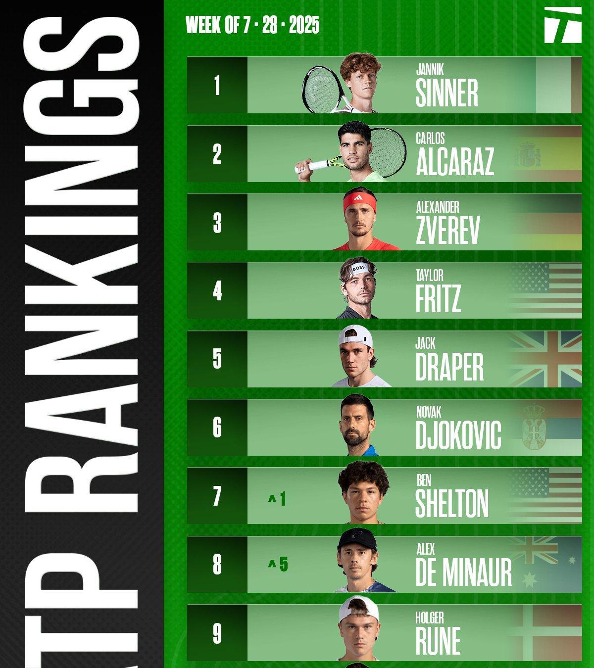 本周TOP10排名: 1、萨巴伦卡 2、高芙 3、斯瓦泰克 4、佩古拉 5、米拉·安德列娃 6、郑钦文 7、阿尼西莫娃 8、凯斯 9、鲍里妮 10、巴多萨 1、辛纳 2、阿尔卡拉斯 3、兹维列夫 4、弗里茨 5、德雷珀 6、德约科维奇 7、谢尔顿 8、德米纳尔 9、鲁内 10、穆塞蒂