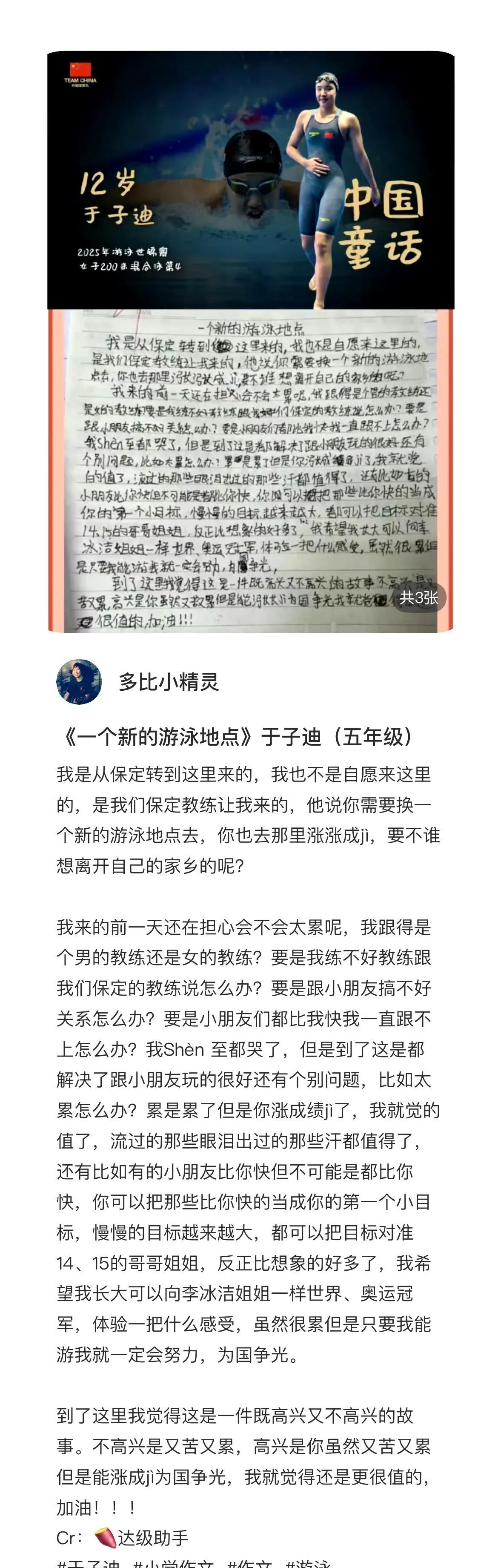 你家12岁的小孩还在干嘛?一定是快乐地躲在空调房里享受暑假。12岁的于子迪却不断地在泳坛打破纪录,她仅仅是一名小学生…… 于子迪的父亲是一位中学物理老师,母亲则是一位钢琴调律师。 6岁时,于子迪第一次接触到游泳就被教练看中,进行系统训练四年后,就达到国家一级运动员水平。 图二:看看她五年级时的这篇优秀作文。