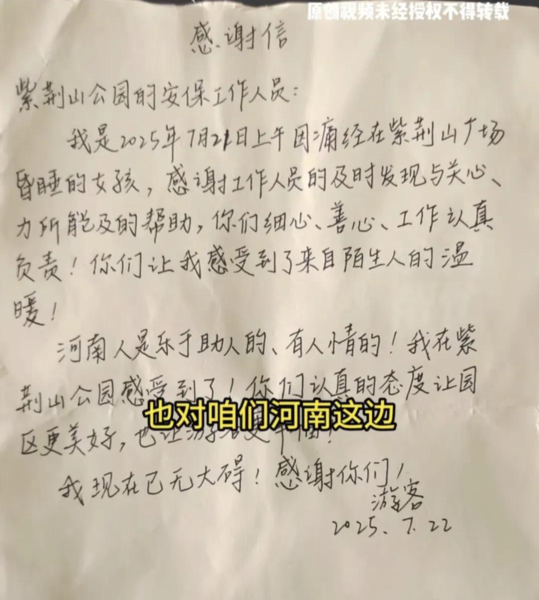 “看哭了!”河南郑州一公园里,3名保安巡逻时,发现一年轻女孩躺在地上,塑料袋套头,一动不动,保安急忙上前询问:同志,有事没有?女孩虚弱的说,她因痛经和高温疼的受不了,才躺在地上,3名保安接连关心女孩,女孩才恢复过来离开,没想到,第2天一早发生了意想不到的一幕,让3名保安感动不已。 7月28日小莉帮忙报道了一件很暖心的事让人感动。 紫荆山公园里,3名保安像往常一样在巡逻,却看到不同寻常的一幕,楼梯大台阶上躺着一个年轻女孩。 保安队长夏丽可急忙上前查看,只看到女孩穿着白色长袖上衣,黑色长裤,头上套着塑料袋,躺在地上,一动不动,身边放着她的随身物品。 他急忙上前关心的询问:“同志,你有事没有?” 女孩没有回应,他紧张的又叫了一声同志,轻轻拍了拍女孩的胳膊。 女孩动了,夏丽可松了一口气,关心的问她有没有事? 女孩揭开头上的塑料袋,虚弱的说:“我肚子疼,我在这躺一会。” 夏丽可想到天气炎热,便说:我害怕你中暑了,晕倒在这,需要帮助吗? 经过简单的沟通,才得知,女孩是因为痛经和高温疼晕在台阶上。 夏丽可非常理解,劝说女孩先找个阴凉地,告诉女孩自己是公园的保安,有啥事就说。 女孩疼的厉害,颤抖着说:我买了水,一会就送来了,我现在有点难受。 另一名保安乔顺安也上前关心女孩,叮嘱她要多喝水,还问她需不需要卫生纸。 随后,三名保安帮助女孩转移到阴凉的地方,让她休息。 而其中一名保安刘彦中正赶上下午班,他便一直陪着女孩,过了三十四分钟后,女孩感觉身体恢复过来了,才离开。 三名保安本以为这是工作中寻常的部分,也是他们应该做的,事后也没有放在心上,只要女孩好好的就行。 可是,没想到,第二天一大早,发生了让他们意想不到的一幕,可给他们感动坏了。 第二天一大早,天空下着雨,女孩一个人冒着雨拎着一袋东西,放在了保安休息门口。 当三名保安打开女孩送来的袋子后,里面是一个西瓜,他拿起来后,发现底下还放了给他们的一张感谢信。 信里面,女孩言辞恳切,都是感谢三名保安对自己的帮助,她说:“是你们让我感受到了来自陌生人的温暖……” 收到女孩送的大西瓜和感谢信,让三名保安有些意外,但是,这对他们来说也是莫大的鼓励。 保安夏丽可说,本来感觉心里很温馨,现在心里感觉更甜了。 三名保安的关心和认真负责,给一个只身在外的女大学生带来了温暖。让她在最无助的时候,体会了人与人之间的善意。 而女孩也懂感恩,冒雨给帮助自己的保安大叔送来西瓜的感谢信,让三名保安大叔的付出得到了鼓励和支持。 善良的保安大叔,和善良懂感恩的女孩,你们都是美好的存在。 有人说,痛经真的特别痛,经历过痛经的人都知道,那种疼痛真是躺在床上两天不吃不喝的,只是下床上个厕所,其余都在睡觉。 所以,女孩可能疼的坐不住了,才躺在被晒热的地上,躺地上想缓解一下疼痛,不过还是挺危险的,大热天再晒中暑了可怎么办,好在遇到了认真负责的保安大叔们。 还有人说,自己躺那的时候感觉没啥事,还能撑着,有人上来关心就突然觉得有点委屈,想哭,自己就没事,有人来关心就想哭。 保安队长说,没想到女孩会送来西瓜,这都是我们正常的工作。 《民法典》第1198条规定:宾馆、商场、银行、车站、机场、体育场馆、娱乐场所等经营场所、公共场所的经营者、管理者或者群众性活动的组织者,未尽到安全保障义务,造成他人损害的,应当承担侵权责任。 公园作为公共场所,保安有责任进行定时巡逻,以维护公园内的正常秩序和保障游客安全。 三名保安像往常一样巡逻,及时发现楼梯大台阶上躺着女孩这一不同寻常的情况,这是他们履行巡视职责的体现。 在了解女孩的情况后,三名保安帮助女孩转移到阴凉的地方让她休息。 作为公园保安有义务为遇到困难的游客提供必要的帮助,他们将女孩从大台阶上转移到阴凉处,是为了保护女孩,避免她因高温中暑。 这种协助转移的行为,是保安履行救助义务表现。 公园保安在遇到需要帮助的人时,伸出援手,不只是为工作负责,也给作为游客的女孩带来了温暖,也为公园营造了良好的道德氛围。 三位保安用他们的行动诠释了责任与善良,而女孩则用她的感恩之心让这份善良有了更美好的延续。 希望这样的温暖故事能在更多地方上演,让我们的社会处处充满爱与关怀,让每一个在生活路上奔波的人,都能在不经意间邂逅这份温暖,感受到人间的美好。 关注@福康说法 从日常点滴学法律,生活安稳更有底