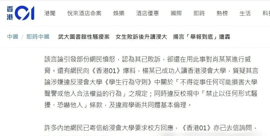 后续来了!杨某媛要危险了! 香港浸会大学已经关注到网上舆情,并在跟进事件发展,并且其行为守则规定“对于任何违反行为守则的大学成员,浸大会根据既定的纪律程序处理”! 看来旁观者清,网友纷纷在浸大回复处留言,这是对正义的发声,也是对诬告者的惩罚,网友决不会手下留情,都期望撤销其保研资格,对杨某的任何怜悯,都是对受害学生和家长的伤害!
