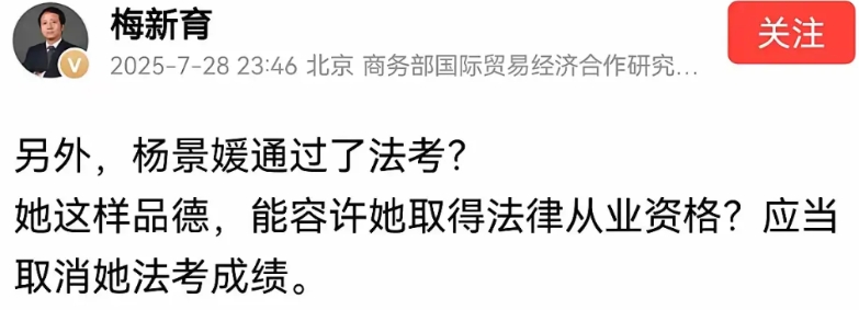 武大保研女的恶行,连校友都看不下去了! 商务部研究院——梅新育:号召武大校友集体向校方施压,要求武汉大学尽快处分杨景媛,维护母校荣誉!同时表示也许会在香港媒体呼吁香港浸会大学,取消杨景媛的博士生录取资格!