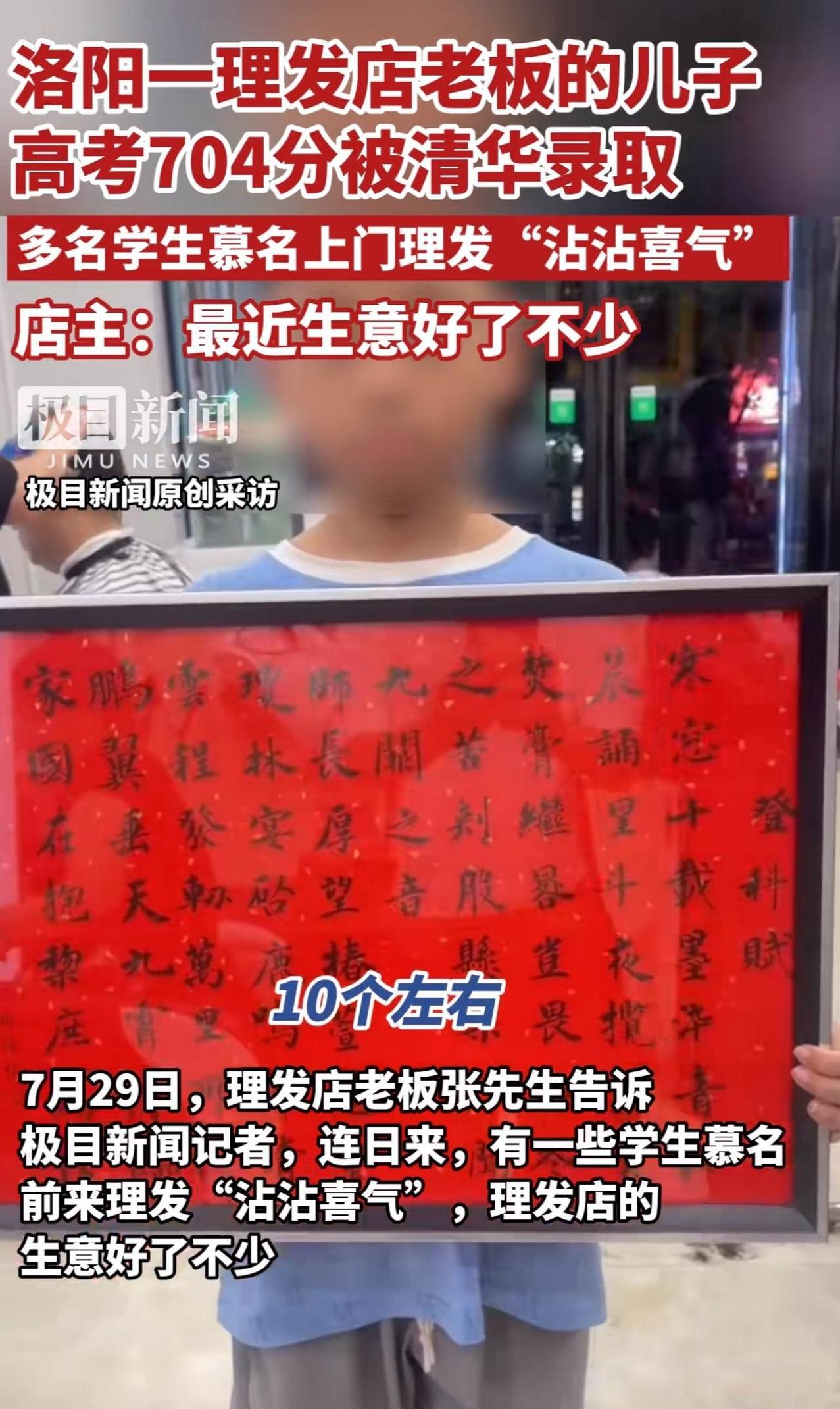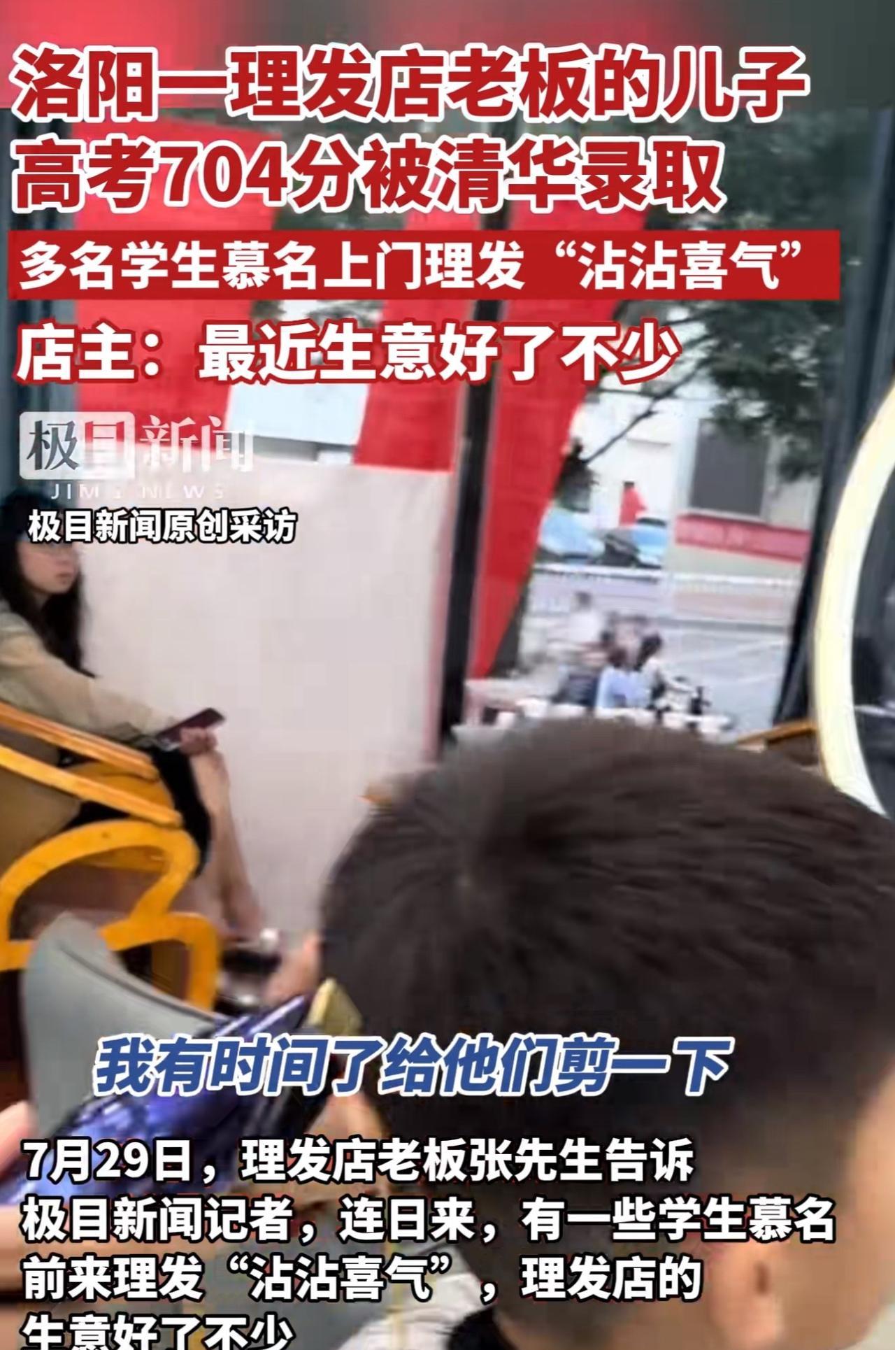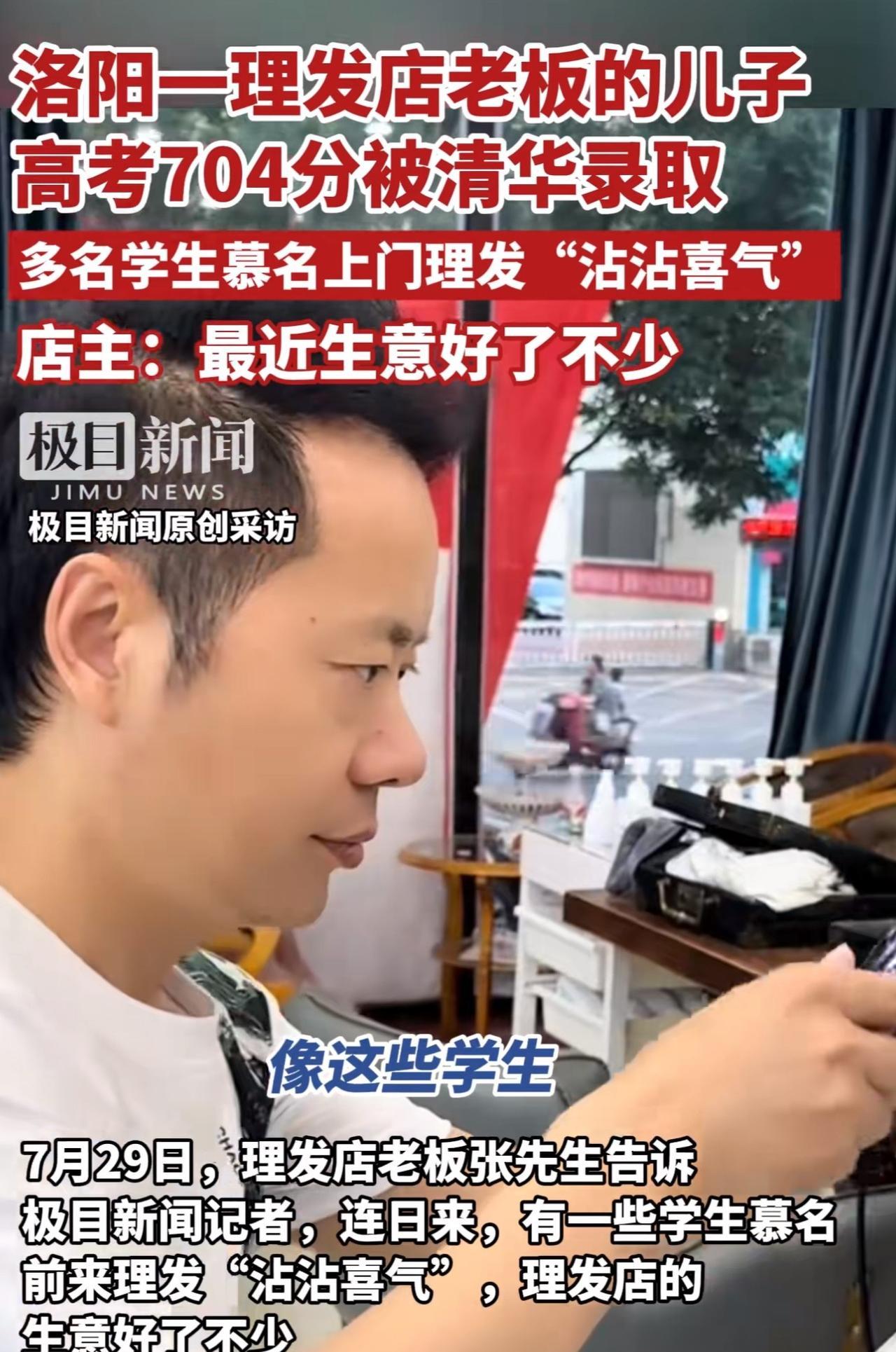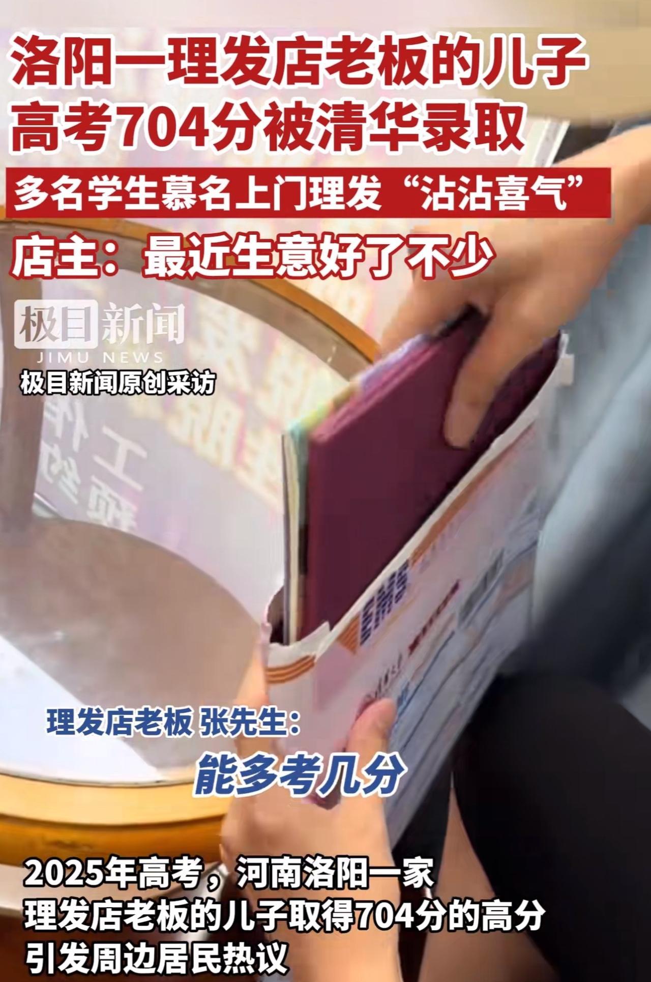 #MCN双量进阶计划#“这真是把家里理发店都带火了啊!!”河南洛阳,一家理发店老板的儿子以高考704分的成绩被清华北大录取,引发热议。 据这位理发店老板透露:“自从儿子考上清华大学,理发店的名气都高了不少,这些天,不少学生慕名来理发“沾沾喜气”,理发店的生意都好了不少。我们全家准备一起去送他到清华大学报到,也在北京转转!” 看完这事儿,周少不得不说洛阳这位孩子真争气,不但自己以高考704分的高分考上清华大学,还把自己家里的理发店都带火了,换谁不得羡慕啊! 更有意思的是,学生们专门跑过去理发,想沾沾喜气,这心情完全能理解。谁不希望自己也能有好运气,学习更上一层楼呢?老板说要全家送孩子去北京报到,顺便转转,想想就觉得是件特幸福的事儿。 其实,这事儿也说明,大家伙儿打心眼儿里佩服学习好的孩子,更羡慕这样靠努力改变生活的家庭。这孩子不光给自己争了气,无形中还成了家里的“福星”,这种靠实力带来的好运,可比啥都实在。 对于这位男孩考上清华带火家里理发店,大家怎么看呢?要是你家附近有这样的“好运地儿”,你会去沾沾喜气吗?#寻美三湘# #长沙新朋友#