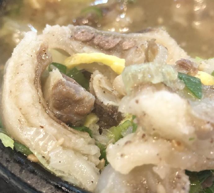韩国网友吐槽江原道平昌服务区的排骨汤,放了一大堆配料,本来还想说商家真良心,结果捞起排骨才发现全是白色的油脂,几乎看不到瘦肉,这才明白放那么多配料是为了掩盖没有去筋膜的排骨。最让她生气的是,这一份居然要卖16900韩元,约合人民币87元,即使在韩国这样的发达国家,这个品质和价格也不成正比。 韩国的饭店是这样的,价格不低,品质不高,当然也有好吃的店,但也是相对来说好吃的。他们的做法比较单一,食材又贫瘠,所以也很难捣鼓出好吃的东西,很多时候也不是商家故意的,就是没东西,所以菜品看起来都抠抠搜搜的。