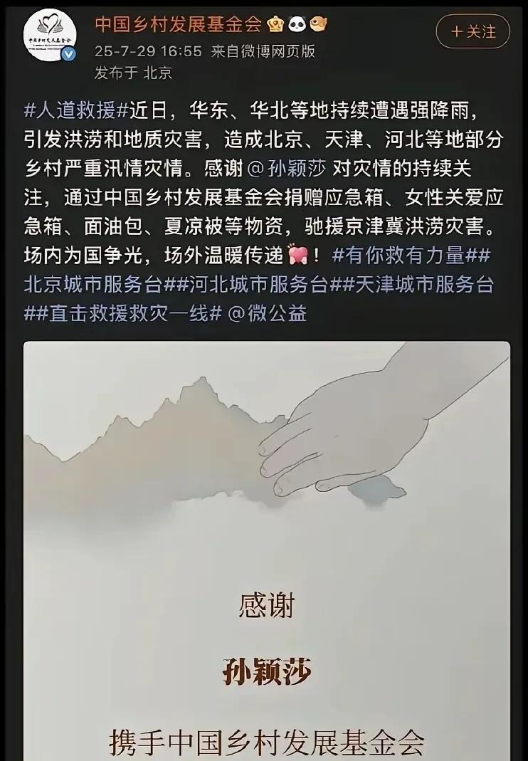 孙颖莎给家乡捐款了! 莎莎看到深圳大学队稳进决赛后,急呼呼的赶回北京, 正好碰到了京,津,冀地区特大暴雨,已经造成洪涝! 莎莎见状第一时间捐款捐物, 支援家乡! 这次莎莎捐的应急包,面油包,夏凉被等,都是非常务实的救援物资, 莎莎有心了!