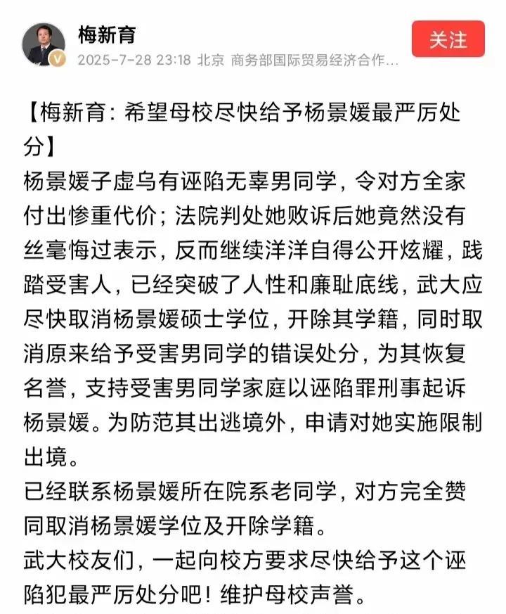 武大图书馆事件,各路大V纷纷噤声,只有武大校友梅新育敢于仗义执言,为受害者肖同学发声,在女拳横行的现代,不得不说,梅新育确实很有勇气。 梅新育建议:希望母校尽快给予杨景媛最严厉的处分,因为杨景媛子虚乌有诬陷男同学,令对方全家付出了惨痛代价,在事实清楚之后,杨景媛竟然还洋洋得意公开炫耀,践踏受害者,这显然已经超出正常人的界限,正常人不应该做出来这样有悖于常理的事情。 这下好了,杨景媛保研的大学,香港浸会大学已经注意到这件事情,而且还有源源不断的网友举报,不知道此时此刻的杨景媛会不会后悔当初的过分行为。 想不通,如此美貌,如此智慧,如此高学历的才女,竟然不懂得宽厚带人,竟然有报复别人的心理,这样的人掌握了权利,可能危害很大。