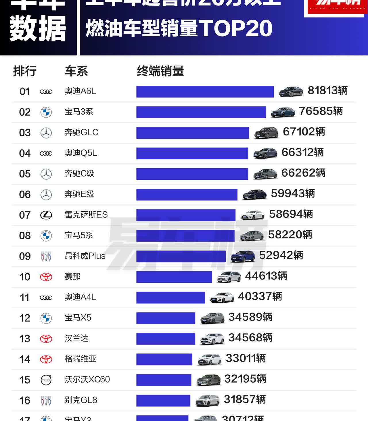 奥迪A6L要是去到电车榜单只能排第五,头部几台爆款效应太强了; 20万+预算买