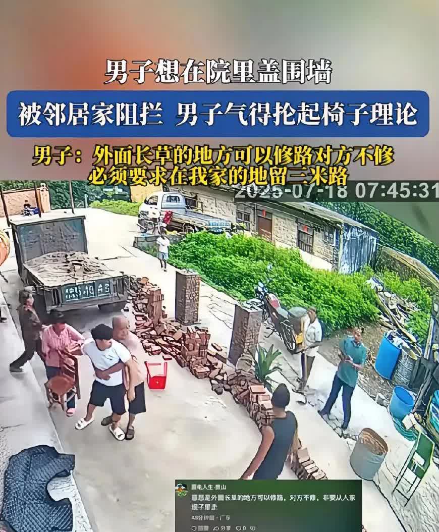 广西一名男子想在自家院子里盖围墙,结果邻居出来阻拦。男子一下就急了,直接抡起椅子