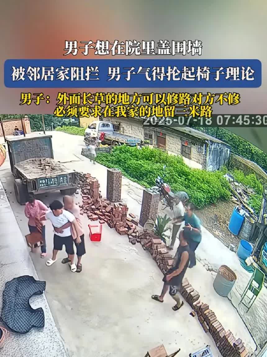 广西一名男子想在自家院子里盖围墙,结果邻居出来阻拦。男子一下就急了,直接抡起椅子要跟邻居理论 。 男子说,外面长草的地方明明可以用来修路,邻居偏不让,非得要求在他家的地里留三米宽,三米之外,靠男子家这边用来修路。你说这事儿闹的,好好的盖围墙计划,被邻居这么一拦,换谁能不火大。 从监控里能看着,现场好几个人,拉扯、争执,气氛特别紧张。本来邻里邻居的,低头不见抬头见,为这么档子事儿起冲突,真没必要。 盖围墙也好,修路也罢,都是生活里的事儿。有不同想法,坐下来好好唠唠,把道理掰扯清楚,比抡椅子吵架强多了。要是因为这事儿结了仇,往后日子也不得劲。 大家住得近,和和气气的多好,遇到问题心平气和商量,总能找到解决办法。可别像这样,为点事儿就红脸、动手,闹得不愉快。希望这事儿最后能好好解决,邻里还能恢复以前的和谐,毕竟过日子,图的就是个顺顺当当 。