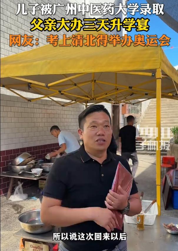 太豪横了!重庆,儿子今年参加高考,考试前爸爸告诉他,如果考得好就给他大办三天酒席,当得知儿子考上双一流的广州中医药大学后,爸爸也没有食言,直接连办三天升学宴,甚至不忘花钱请演员过来表演 据悉,孩子今年高考总分考了572分,这个成绩已经超出了父亲的期望,随后一家人商量后,报考了广州中医药大学,在如愿被录取后,父亲也是兑现了自己当初的豪言 他专门请人在家里搭舞台,连续大摆三天的升学宴,就是毫不吝啬的向父老乡亲表达自己的骄傲心情 对此,网友们也是看法不一 有网友认为:没必要这么高调,只是一个大学而已,这要是考上清北还不得办个奥运会啊 但也有网友表示:要是我儿子能考上我也想摆,既然能连摆三天,就说明不是为了收礼,只是分享喜悦,没问题 其实,这事要是换个角度看,反而挺打动人的。不是所有家庭都能做到“说到做到”,关键是这个说到做到的承诺 三天升学宴不便宜,还请演员助阵,说白了,就是想把这个节点过得有点仪式感,让孩子知道,努力是被看见的,成绩是有回报的 在人家父亲心里,这就是天大的事。一个孩子能踏踏实实读书,考出好成绩,走出县城,去更大的城市上大学,这已经是跨了一大步。父亲愿意张罗三天酒席,不是炫耀,是在庆祝一个家庭几十年努力终于有了回响 从这点看,这不是高调,而是一种真情流露。只不过,有人能低调表达,有人愿意敞开大门,把欢喜拉出来晒晒太阳。没对错,只是方式不同 #儿子考上双一流 父亲大办3天升学宴#
