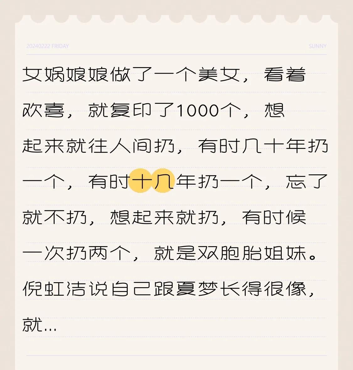 女娲娘娘做了一个美女,看着欢喜,就复印了1000个,想起来就往人间扔,有时几十年扔一个,有时十几年扔一个,忘了就不扔,想起来就扔,有时候一次扔两个,就是双胞胎姐妹。 倪虹洁说自己跟夏梦长得很像,就是这回事。