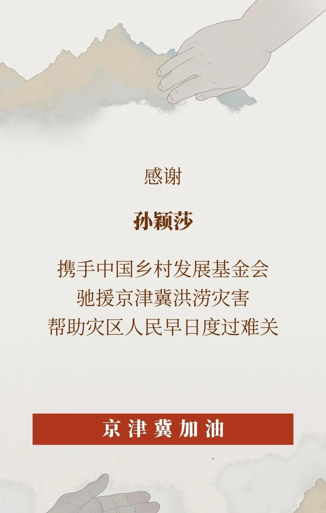 孙颖莎又为家乡洪涝灾害做贡献啦! 今天下午,乡村发展基金会又发文感谢了孙颖莎,为京津冀洪涝灾害捐助! 最近的北京和周边地区的强降雨把北京周边的水库都给灌满了!尤其是密云水库开闸泄洪,给下游造成极大的压力! 莎莎是每次都关注有需要的地方,带头冲锋捐钱捐物!真是个正能量的好宝宝![加油][加油][加油]