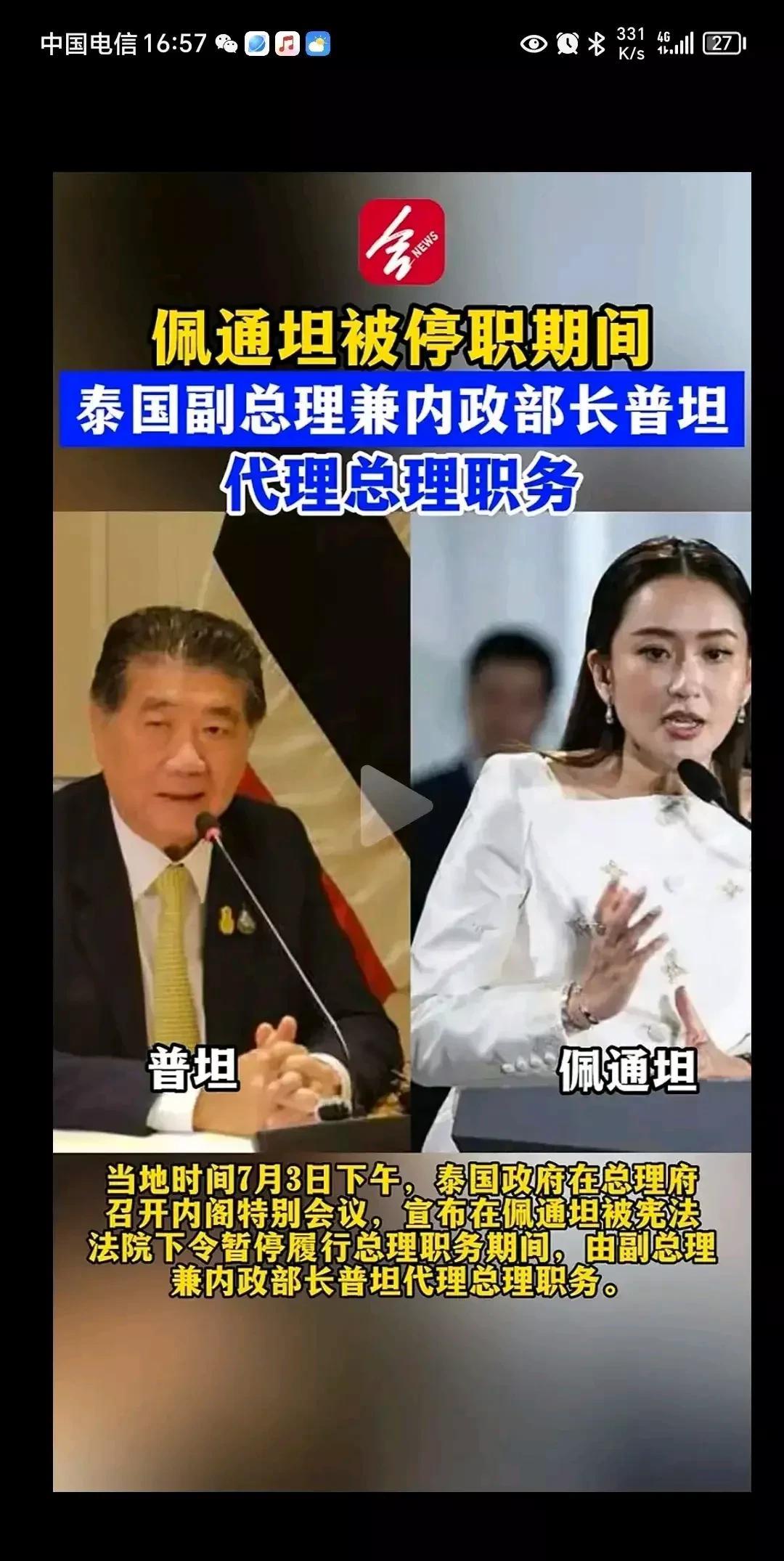 泰国代总理普坦在签署了停火协义后,第一时间对中国的调停表示感谢!对东盟也表示感谢,普坦是一位华侨华人,祖籍泉州尔后移居潮州,讲闽南话,对中国有深厚的感情,在中泰铁路建设等方面大力帮助中国,如果佩通坦无法继续担任总理,由普坦担任总理对中国也是十分有利,普坦与佩通坦不管谁任总理对中国都有利,两人对中国都友好。