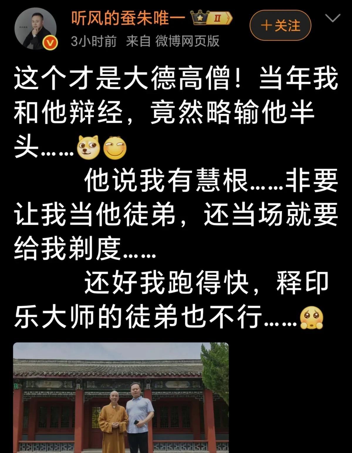 太有意思了!军事博主听风的蚕差点被释印乐递度出家! 听风的蚕和释印乐大师可是正儿八经的河南老乡,一个桐柏一个南阳,隔着百十公里喝的都是淮河水。 当年听风的蚕去白马寺采风,本来想拍拍古建筑,结果撞见释印乐在菜园子开翻地,一身灰布僧衣全是泥点子,俩人用河南话一唠就熟了。 后来方丈拉着他辩经,从《金刚经》讲到现代军事,听风的蚕这个军事专家愣是被辩得接不上话,可见释印乐的知识那是相当渊博的。 大师和他越聊越觉得听风的蚕有慧根,抄起剃刀就要现场给他剃度,急得听风的蚕捂着头窜出禅房,边跑边喊“中中中!下回再论!” 这段“刀下逃发”的往事成了他的经典段子,老乡见老乡,递刀剃光头!幸亏听风的蚕跑得快,不然现在直播都得戴假发解说印巴冲突了! 这才是真正的出家人! 哈哈!大家对此怎么看?