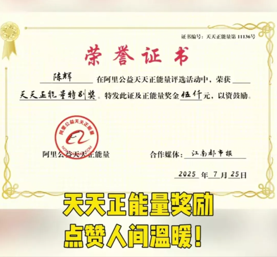 因为他的善举,他在阿里公益天天正能量评选活动中,荣获了天天正能量特别奖荣誉证书和5000元奖金。