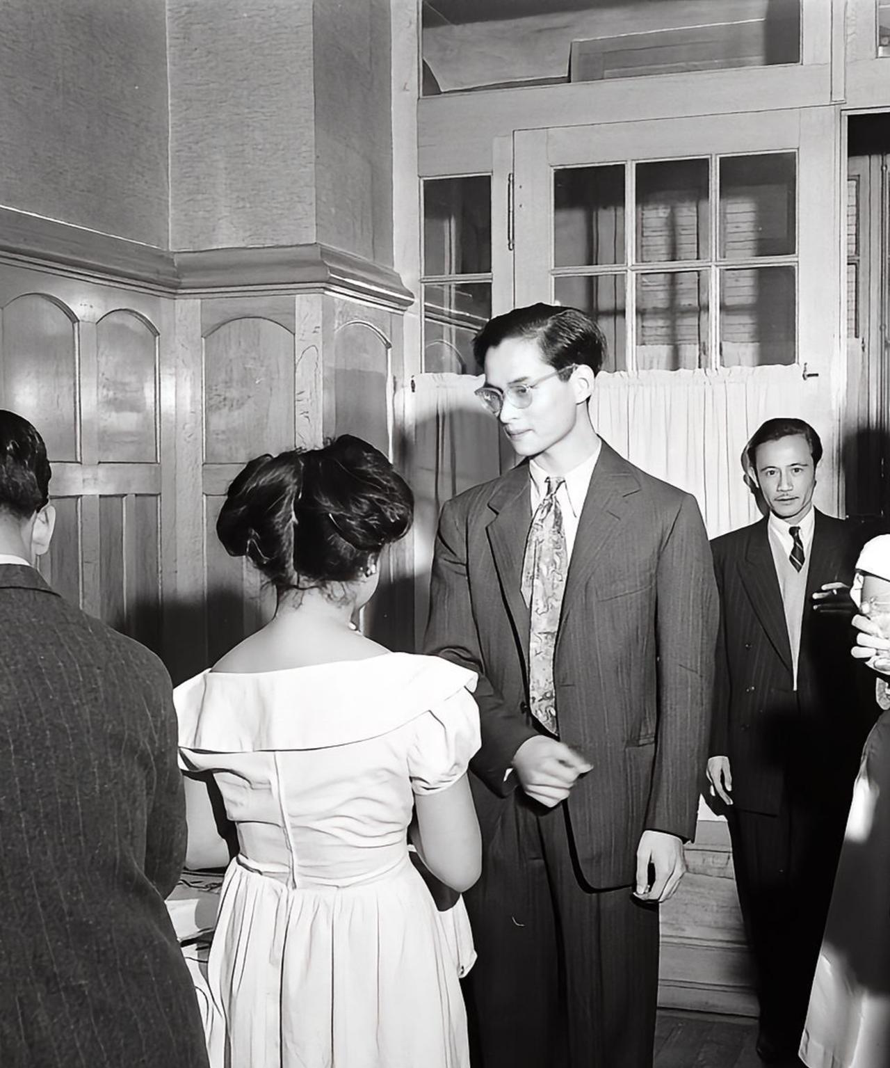 年轻时的普密蓬和诗丽吉,真正的郎才女貌 1949年12月12日,世界级杂志《生活》的40岁乌克兰摄影师德米特里·凯塞尔,拍下名为“暹罗国王”的照片组。聚会氛围简单友好,多年过去,照片依旧清晰锐利。