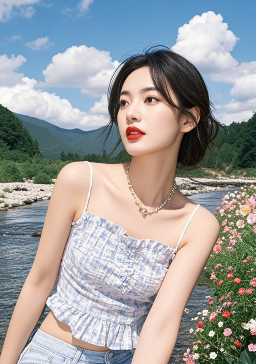 风起,裙袂飞扬,似要乘水而去,又似为溪畔添翼。