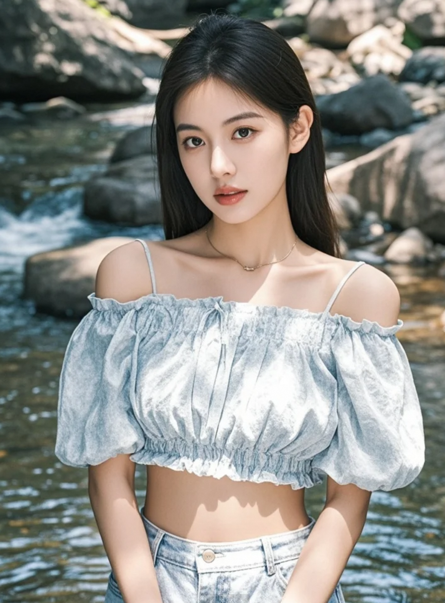 风起,裙袂飞扬,似要乘水而去,又似为溪畔添翼。