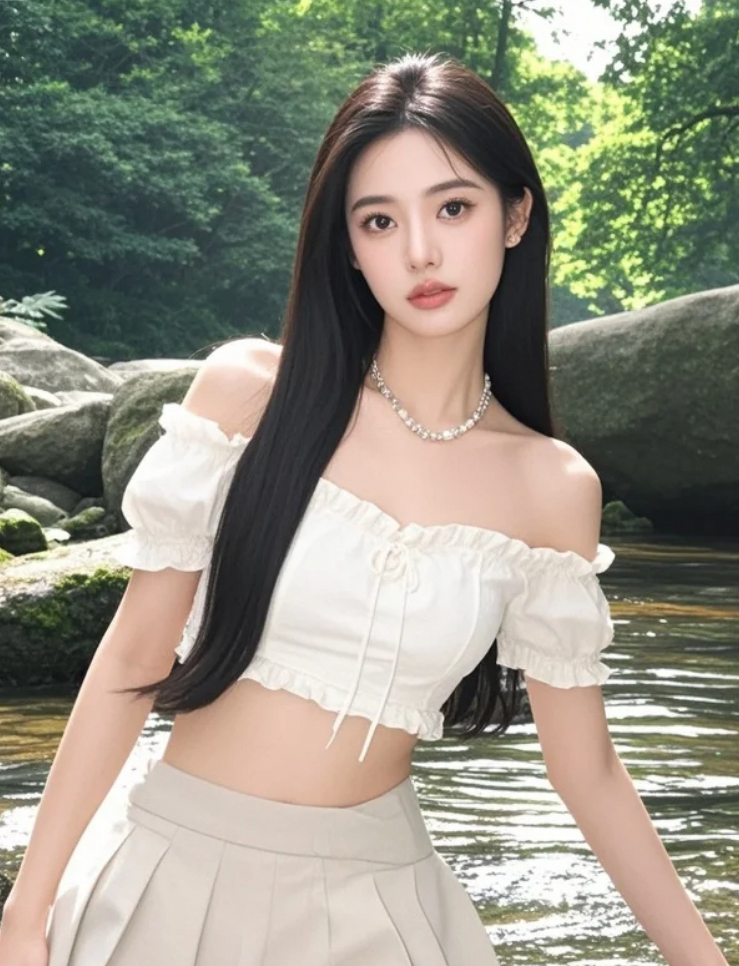 风起,裙袂飞扬,似要乘水而去,又似为溪畔添翼。