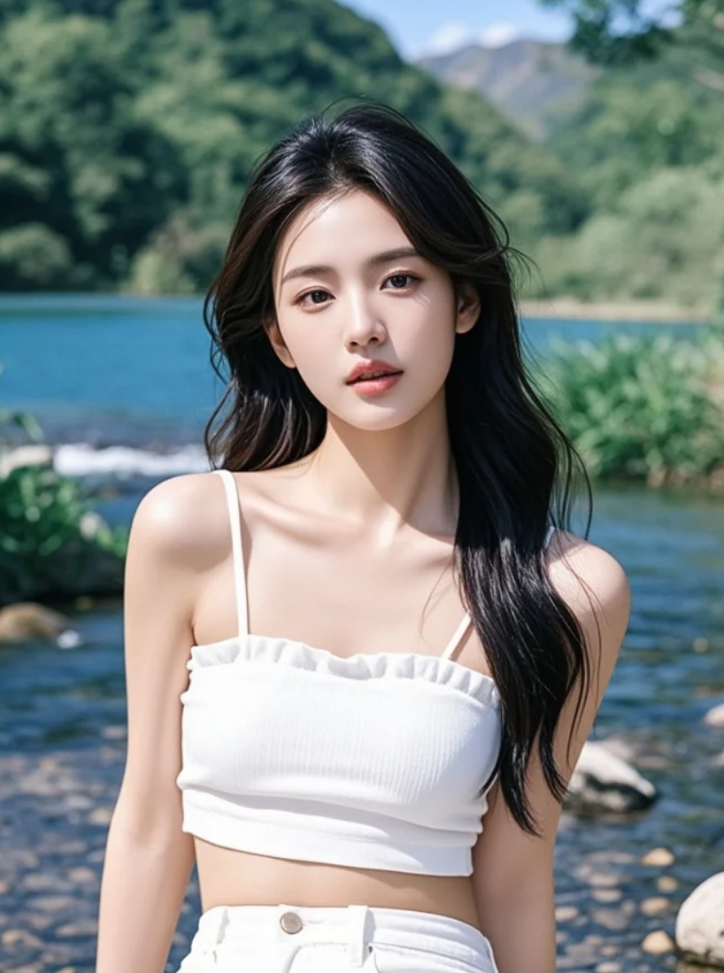 风起,裙袂飞扬,似要乘水而去,又似为溪畔添翼。