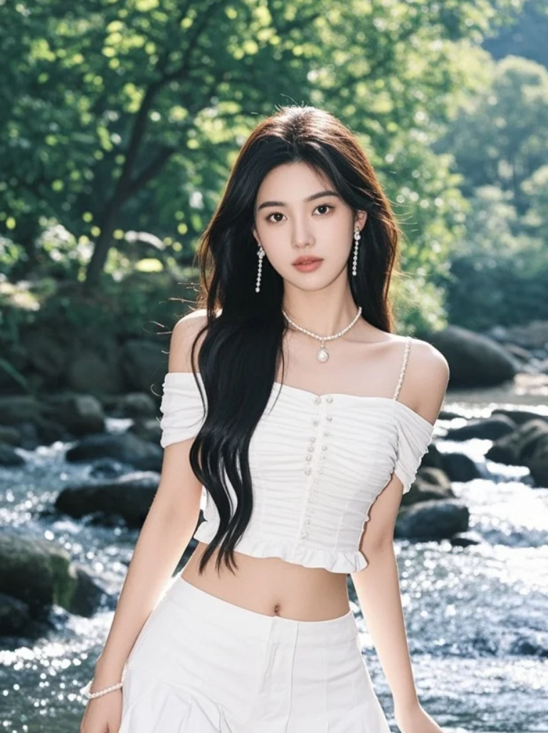 一袭白裙映碧水,点燃了整条幽静的溪谷。