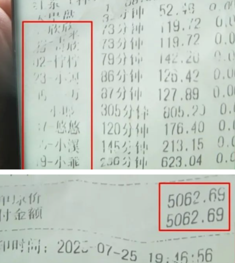 工作人员解释称,中途来的那几位都是店里的金牌陪练,每小时收费200元,再加上提供的酒水和零食,所以5062元一分钱都没多收。
