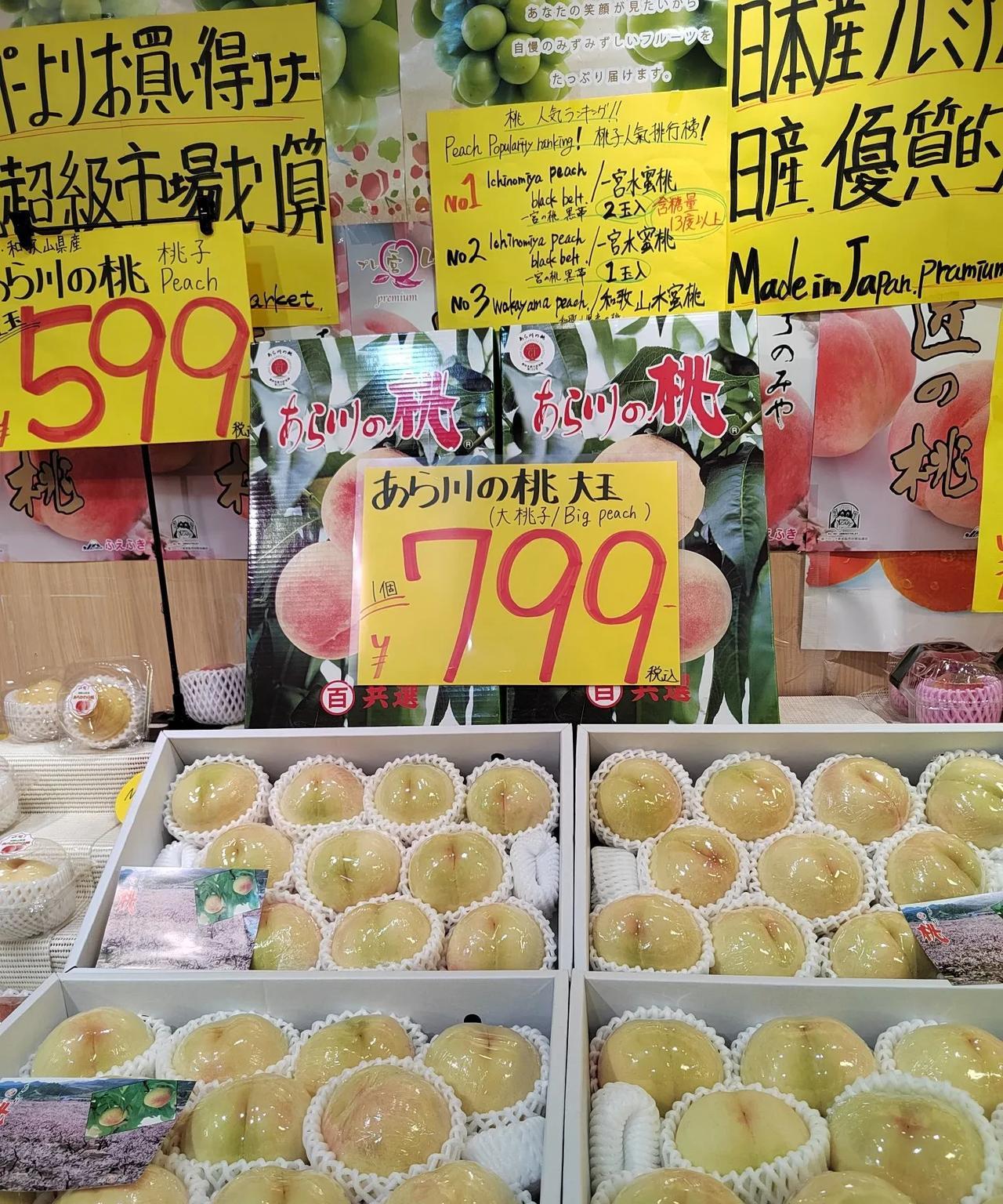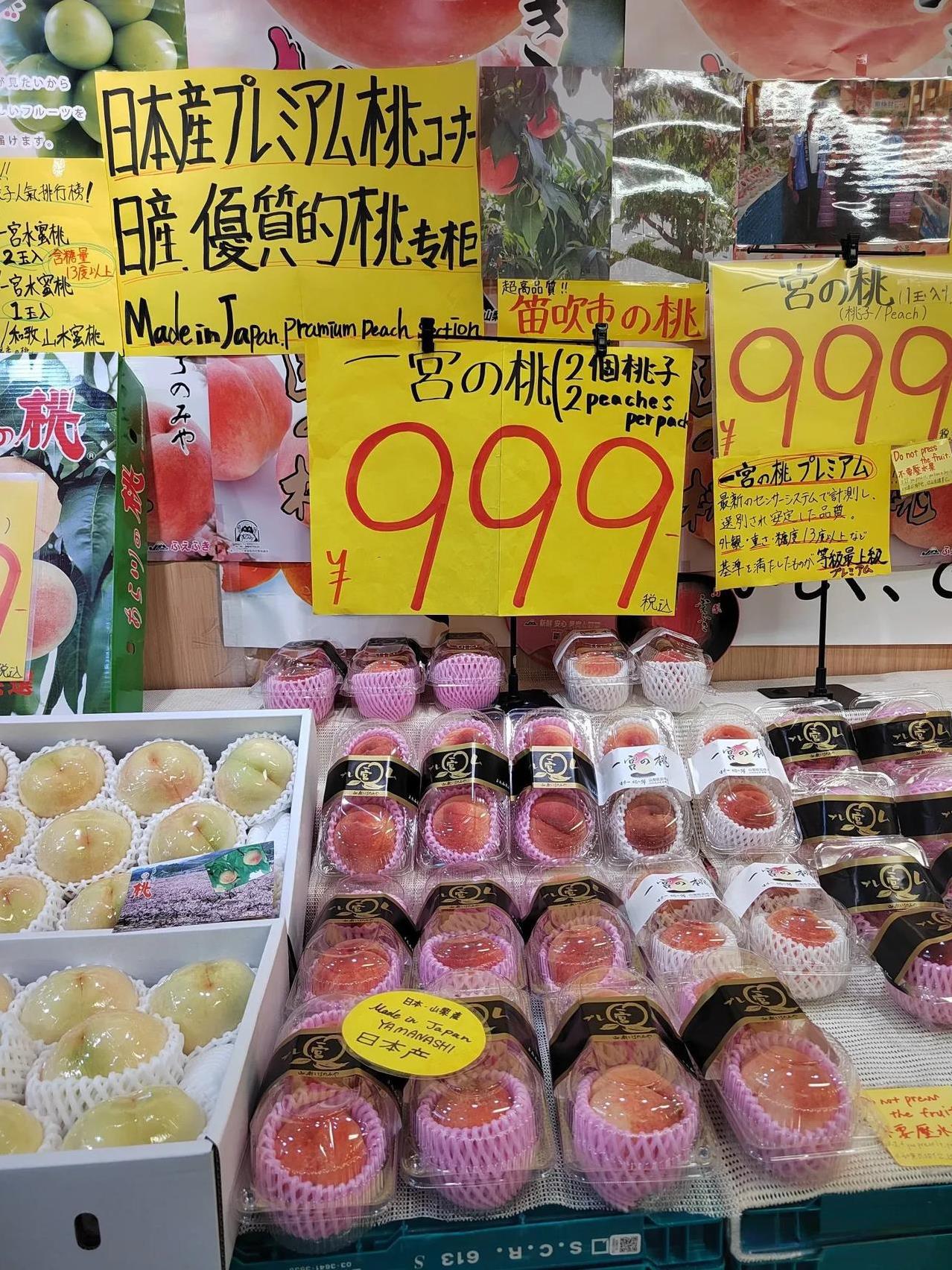 小日子不光是西瓜贵,什么水果都贵。 图1这个桃子一个就要999元,图2的桃子小一